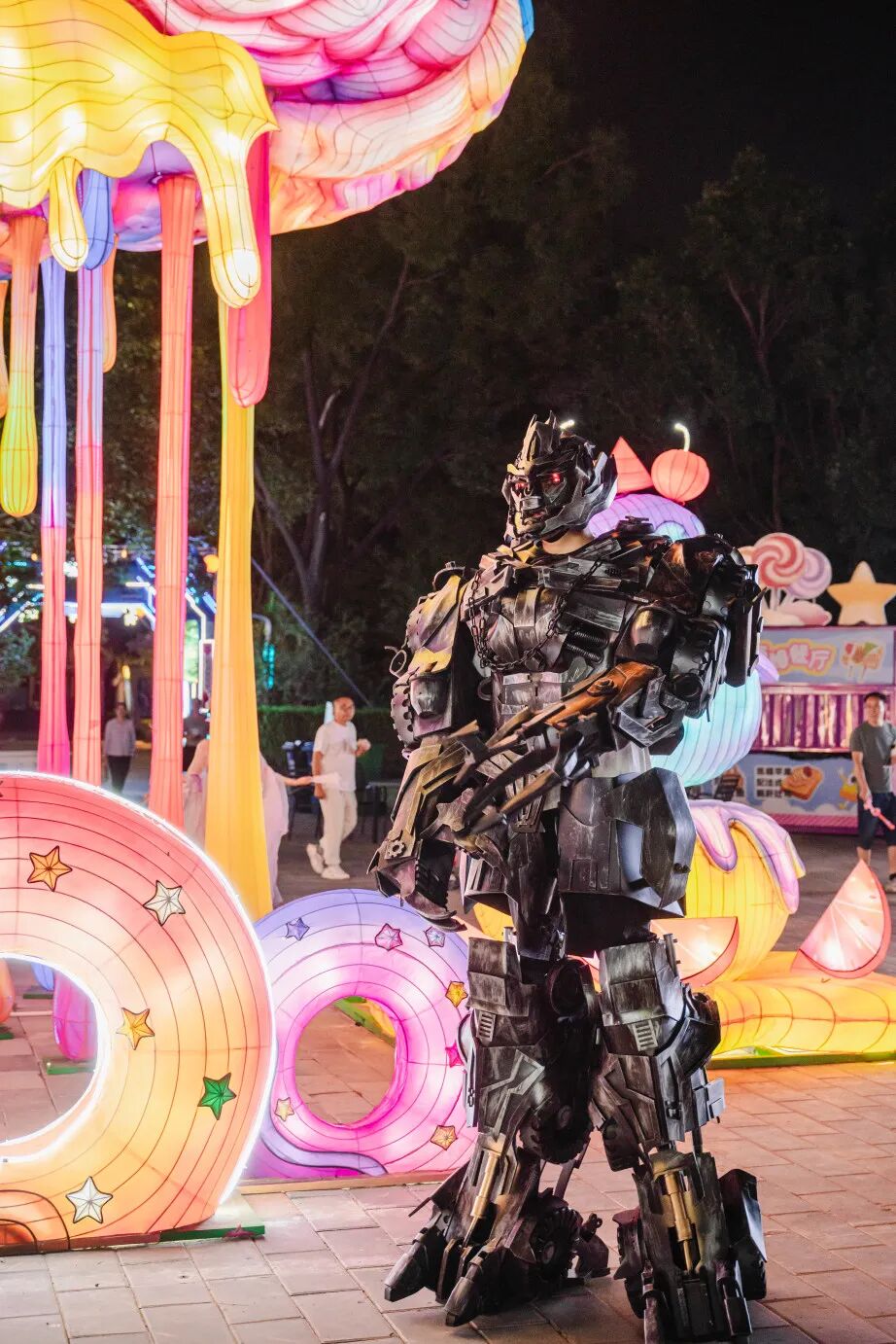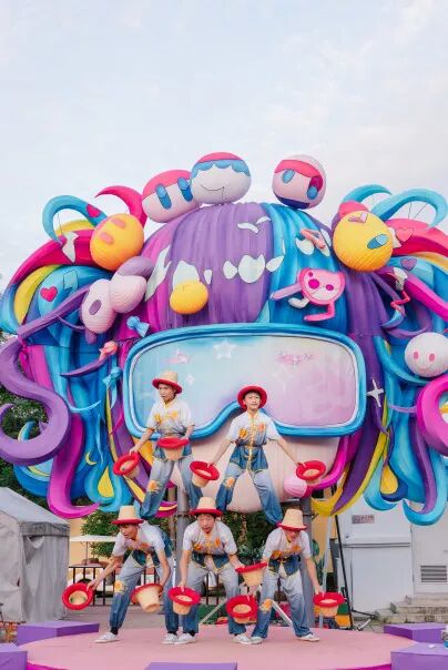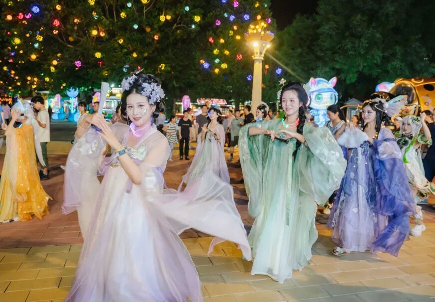 「京彩」的夜不止有光影,还有随时点燃气氛的巡游狂欢。每晚18:00与20:00,两场全园巡游准时登场。国风汉服与二次元装扮的演员们跟随机甲花车缓缓行进,音乐与舞蹈把气氛推向高潮。