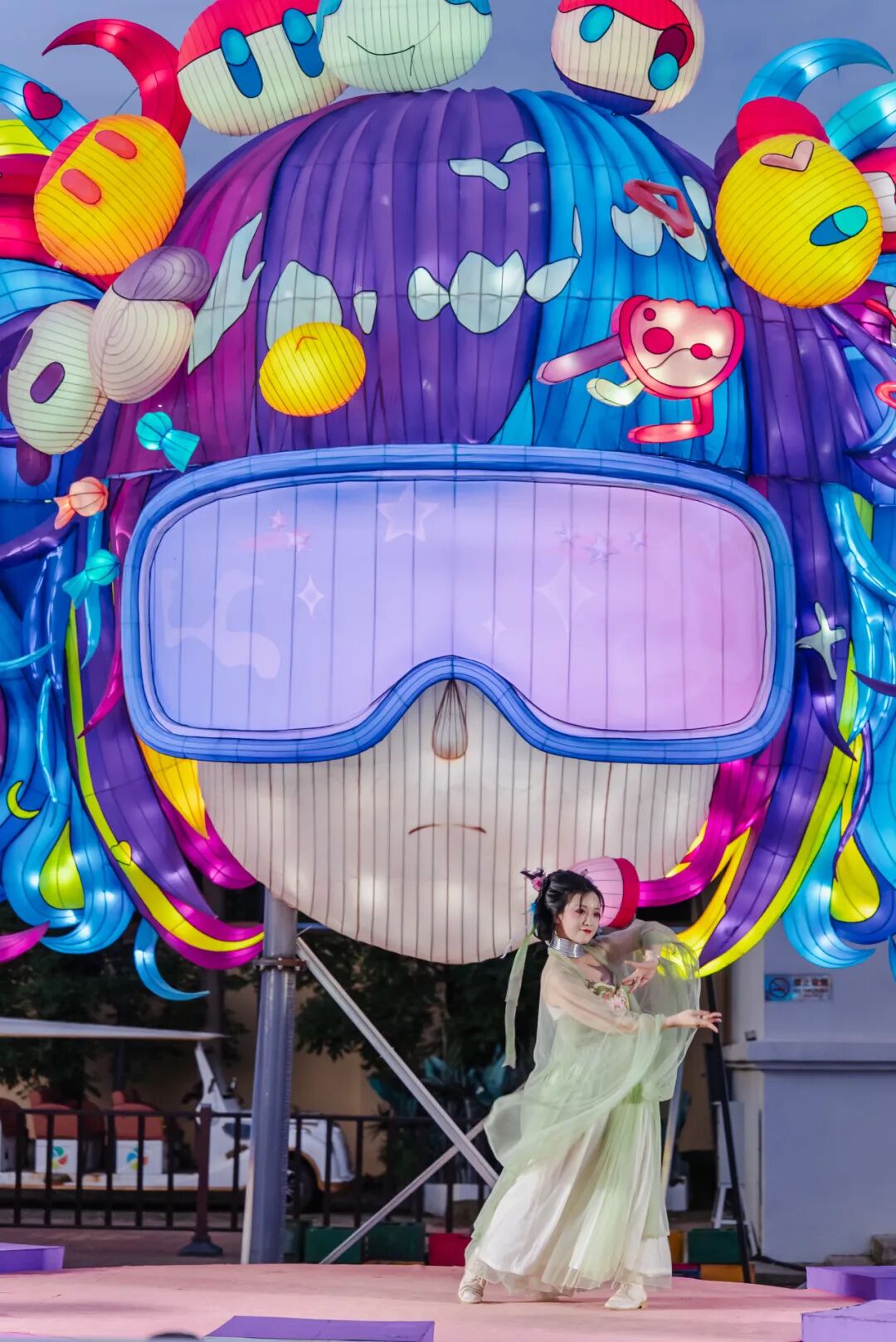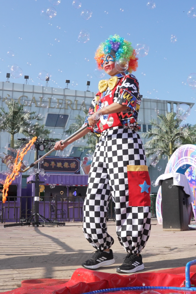 在灯会的氛围里,舞台节目让夜晚更热闹也更好玩。东园波音广场与西园摩天轮下,不同音乐类型演出轮番登场。汉服舞蹈在舞台灯光下展开,古风氛围瞬间拉满;杂技表演紧张刺激,小丑表演轻松幽默。