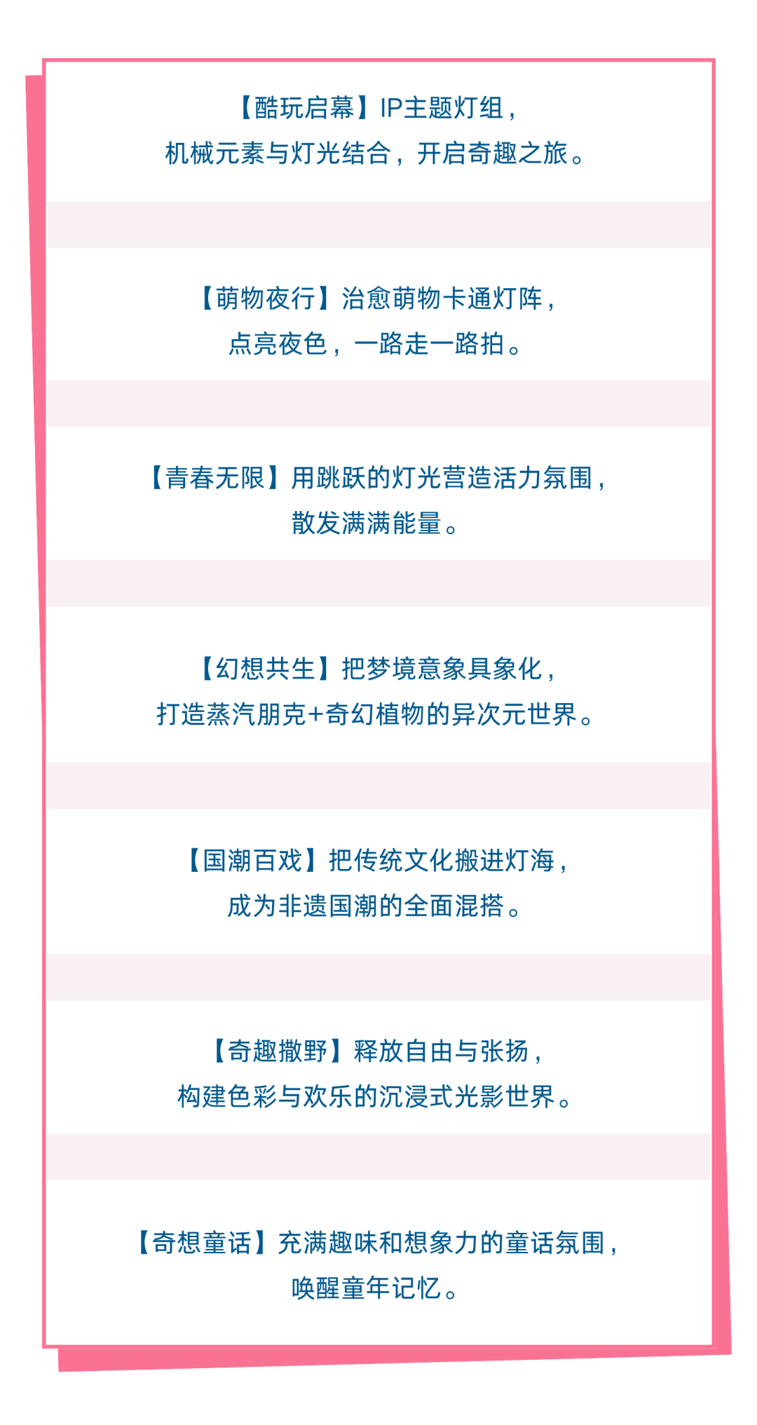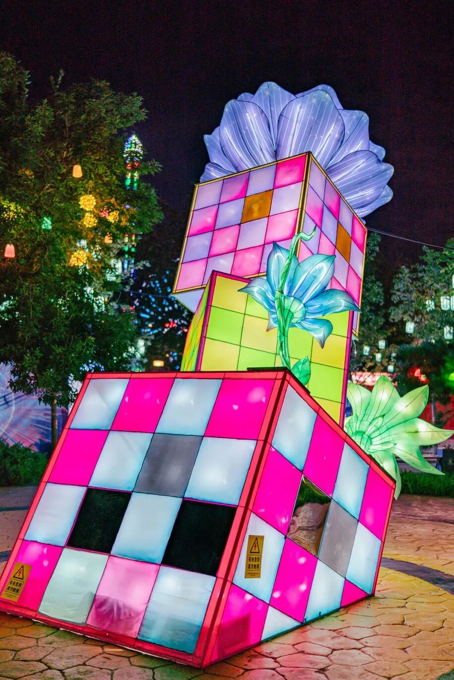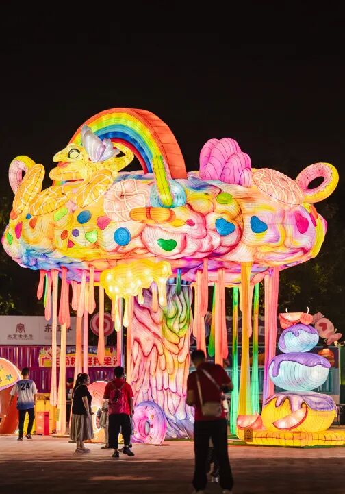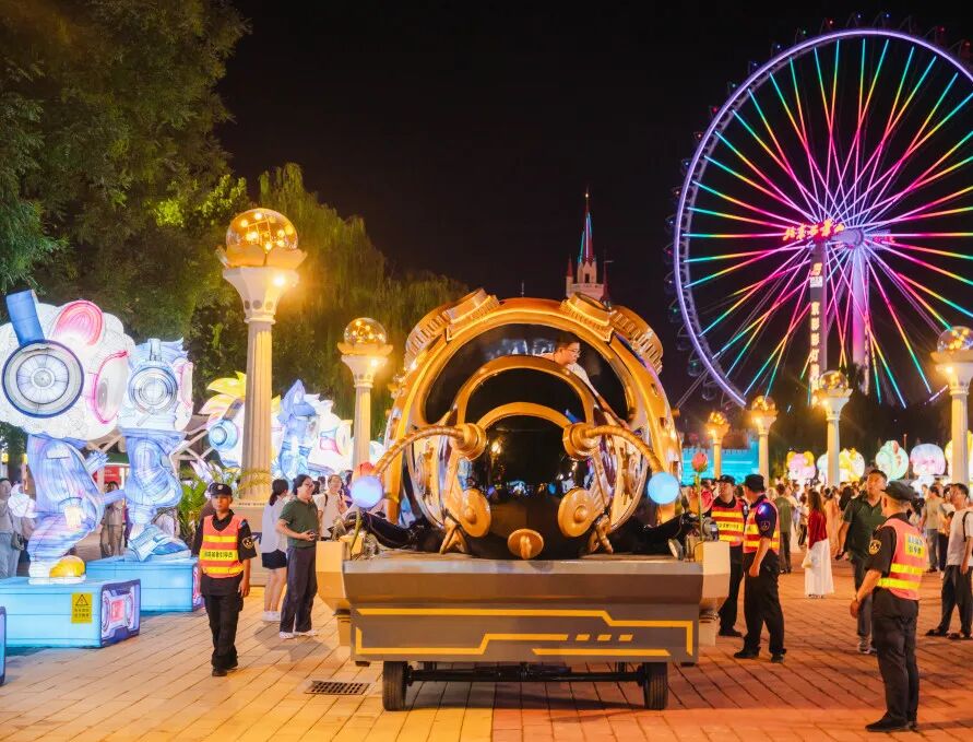 摩天轮下逛夜市,游乐园里赏彩灯。“次元夜游·光影奇旅”中的七大主题展区,从灯光、造型到互动装置各有侧重,将萌物、国潮、蒸汽朋克等潮流元素与传统彩灯技艺碰撞,既有国风非遗、卡通元素,也有赛博科技、次元漫游。分区式的夜游打卡,每一区都能带来新的视觉体验和沉浸式夜游。