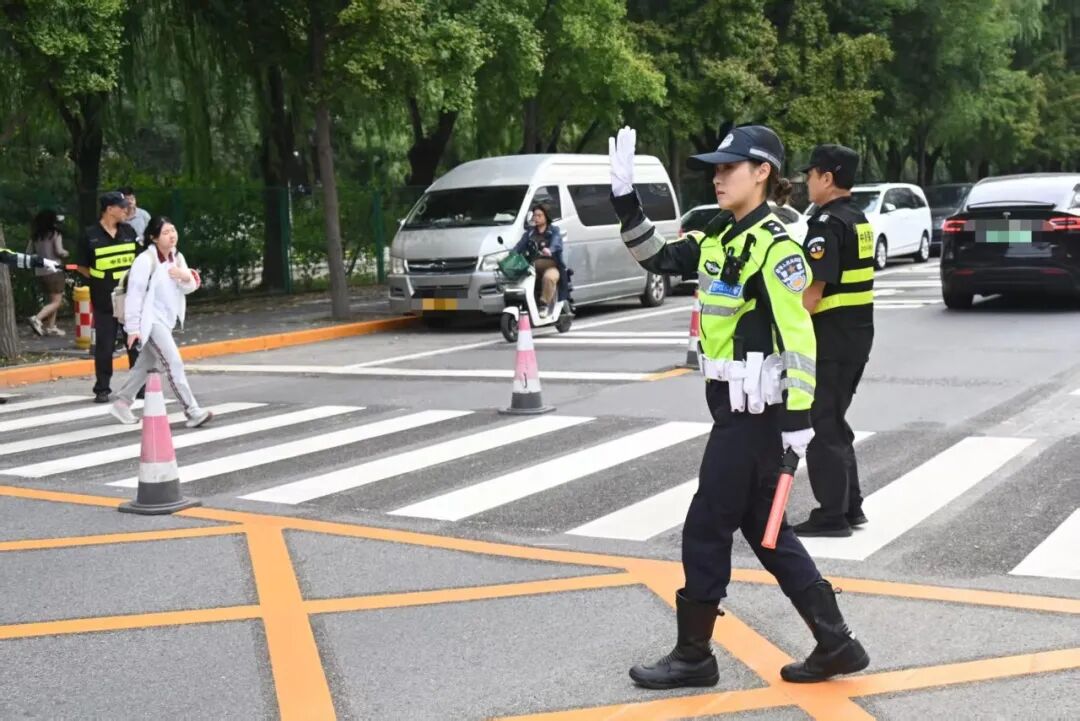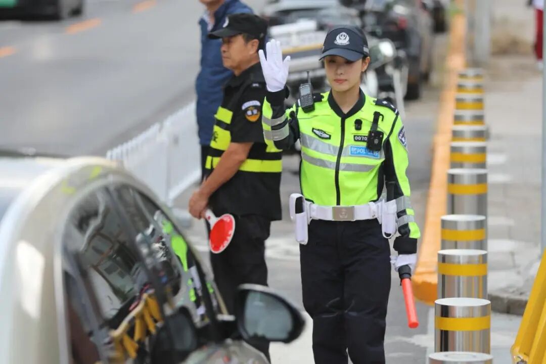 不仅仅是安全护送,女警们的准备工作同样细致到位。在校门口,约80米长的安全等候区和醒目的黄色禁停网格线,为学生和家长划出了专属的“安全区域”。每天到岗后,女警们会首先巡逻校园周边,清理违停车辆,确保交通畅通。随后,她们会在学校门前路段摆放锥桶,防止车辆掉头,最后值守在校园门口,确保学生安全过马路。