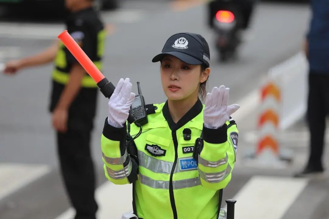 在斑马线前,当一辆轿车想要抢行,熊珺瑶立即伸出手臂,标准地做出停止手势,并微笑着对车里的司机说:“您好,请稍等一下,让孩子们先过。”