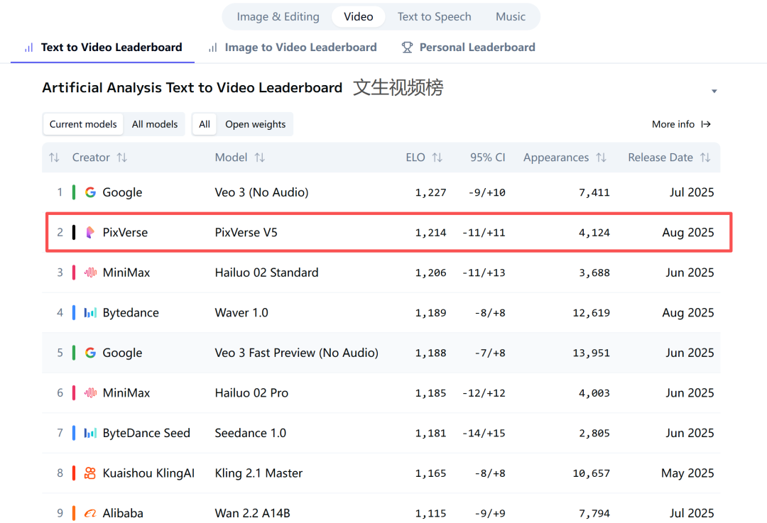 ▲PixVerse V5大模型在Artificial Analysis评测中位列文生视频排行榜全球第二