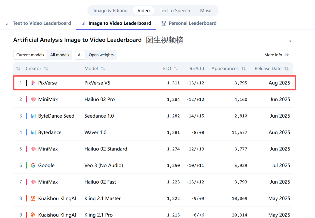 ▲PixVerse V5大模型在Artificial Analysis评测中位列图生视频排行榜全球首位