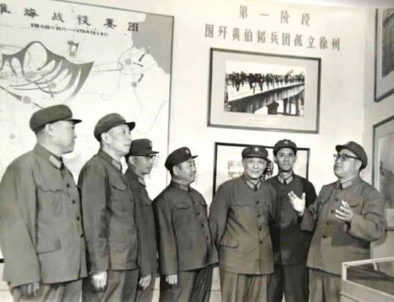 阎川野军长(右)和二十七军党委成员参观西柏坡纪念馆时讲述淮海战役的作战情况。