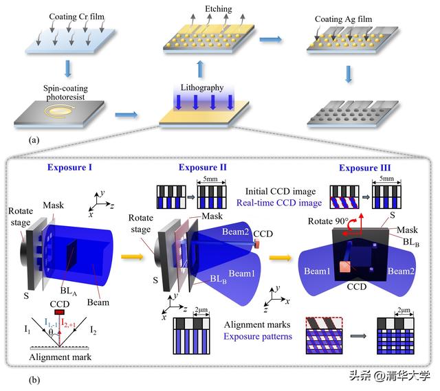 为应对混合光栅在结构尺度上跨越纳米级(~500nm)至毫米级(~1.5mm)线宽的加工需求,研究团队提出并实现了一种的混合光刻策略。该策略以掩模光刻和干涉光刻为核心,通过多步曝光流程,在同一基底上构建周期性纳米结构与非周期性微米图案,实现了跨三个数量级尺度结构的高精度共层制造。