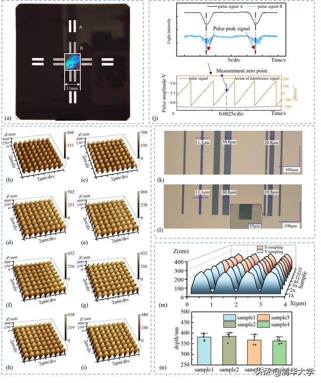 研究团队对加工样品进行了系统的表征与测试。在实验样品中,纳米级线宽的周期性结构具有长达11mm的连续区域。通过对多个区域进行原子力显微镜(AFM)测量,结果显示微结构尺寸高度一致,充分验证了干涉光刻在大尺寸范围内实现高一致性微纳结构制备方面的显著优势。将该样品集成于干涉测量系统后,实验实现了在3000μm范围内优于1nm的位移分辨率与±0.4 nm的测量重复性,同时具备绝对定位能力,展现出优异的测量性能。