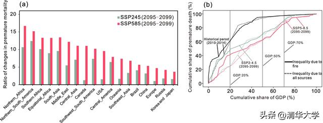 研究发现,随着气候变暖与干旱加剧,未来全球野火活动将显著增强。在中等排放情景(SSP2-4.5)下,到本世纪末,全球野火碳排放与当前水平相比预计增加约23%,全球每年约有140万例过早死亡可归因于野火烟雾PM₂.₅暴露,为当前水平的6倍(图1)。全球变暖不仅加剧野火污染健康风险,也改变了其在不同区域和经济体之间的分布特征。欠发达地区在全球未来野火健康负担中的占比仍然巨大,然而在全球高升温情景(SSP5-8.5)下,未来发达国家地区野火活动大幅增多,在人口老龄化趋势下,其野火健康风险在全球的占比将明显提升,影响了野火PM₂.₅暴露健康风险的区域差异化格局(图2)。