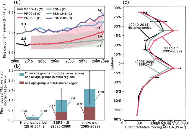 图1.野火排放的历史变化、未来预测及其对PM₂.₅健康效应和直接辐射强迫的影响