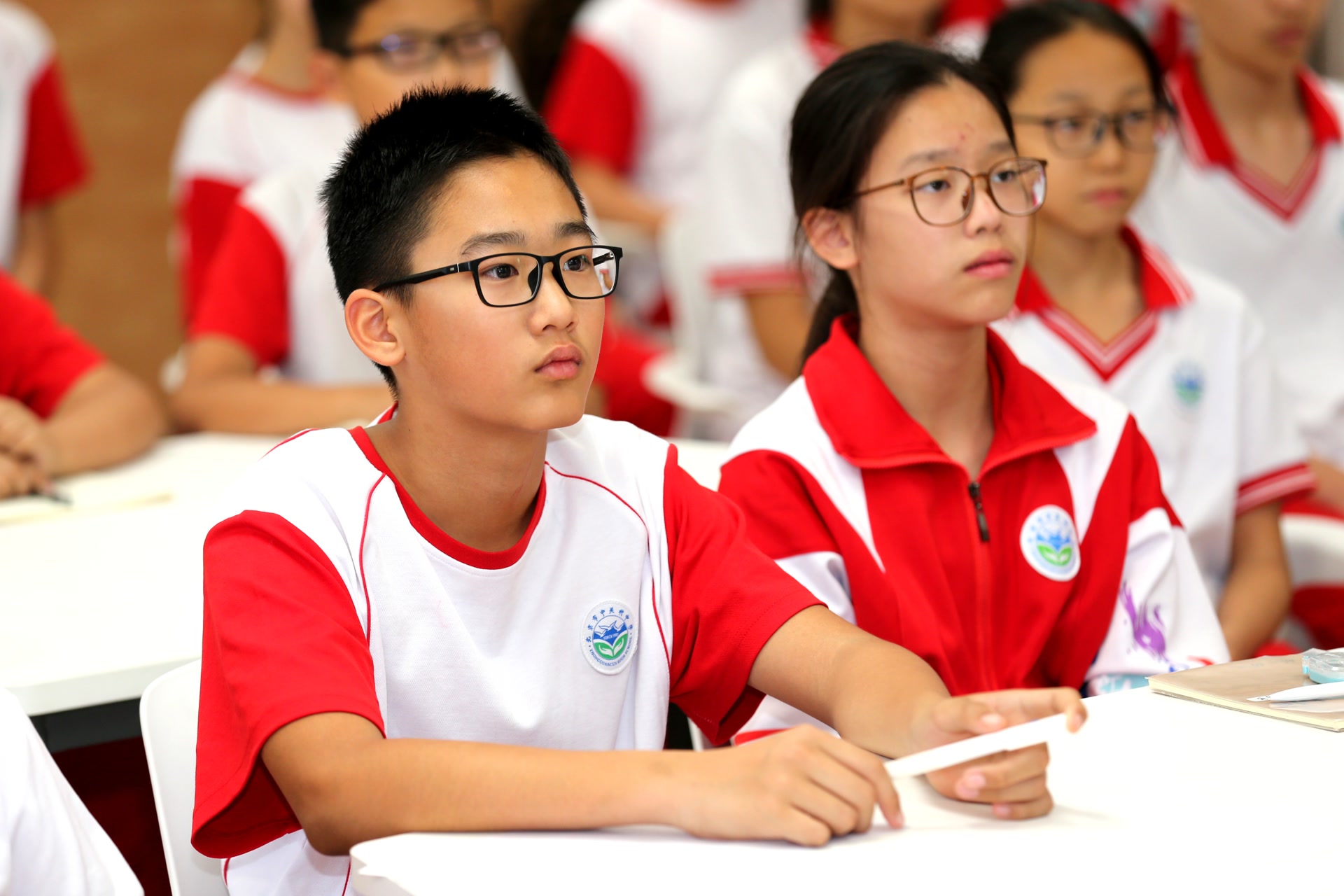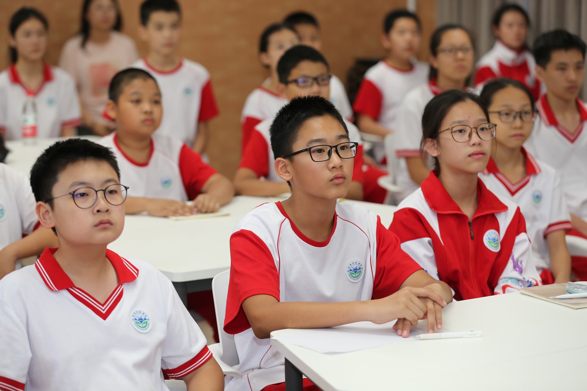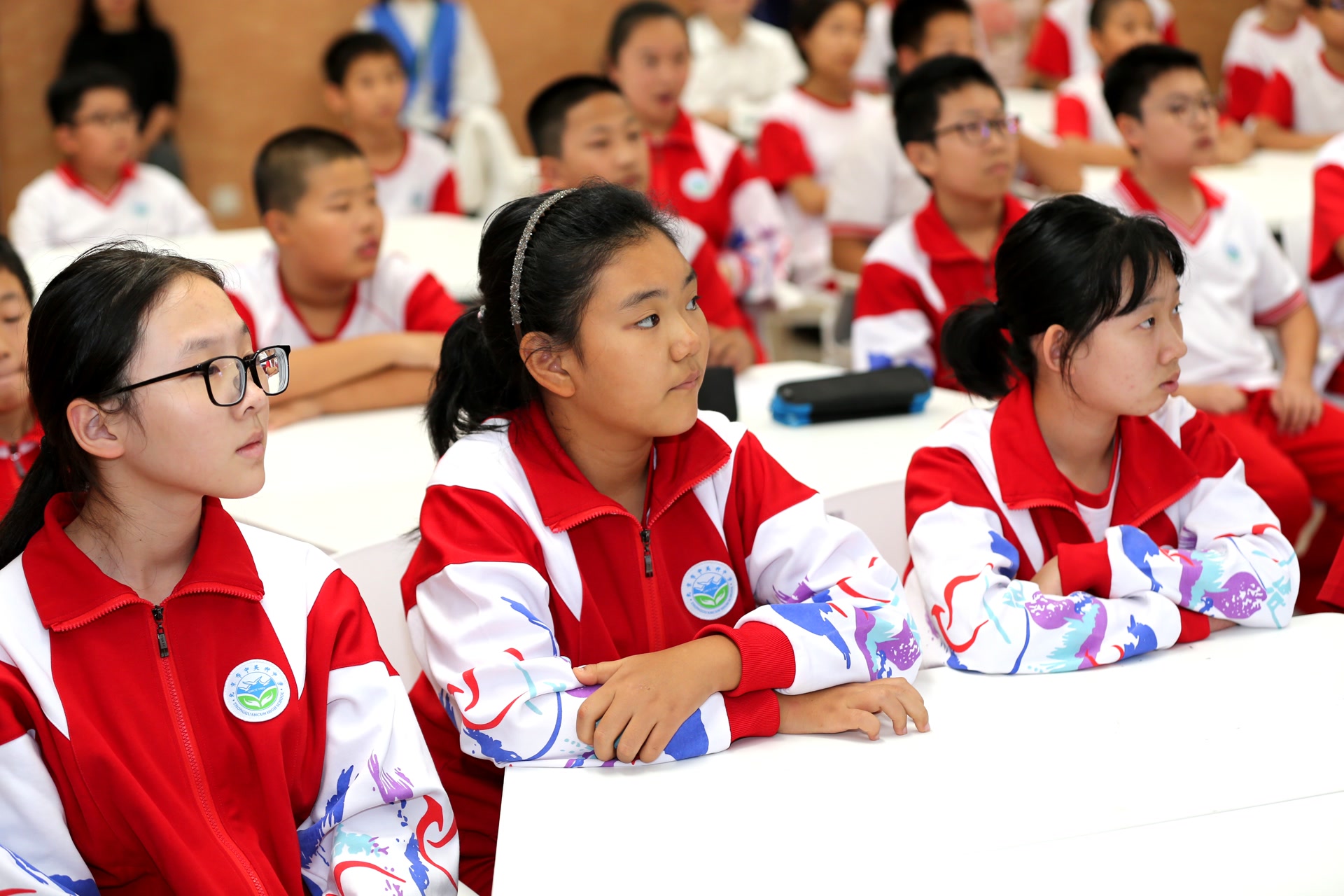9月18日,在北京市中关村中学双榆树校区,中国地质大学(北京)海洋学院副院长由雪莲(右)和中国矿业大学(北京)力学与土木工程学院院长左建平正在为初一年级的同学们讲生命起源的故事。
