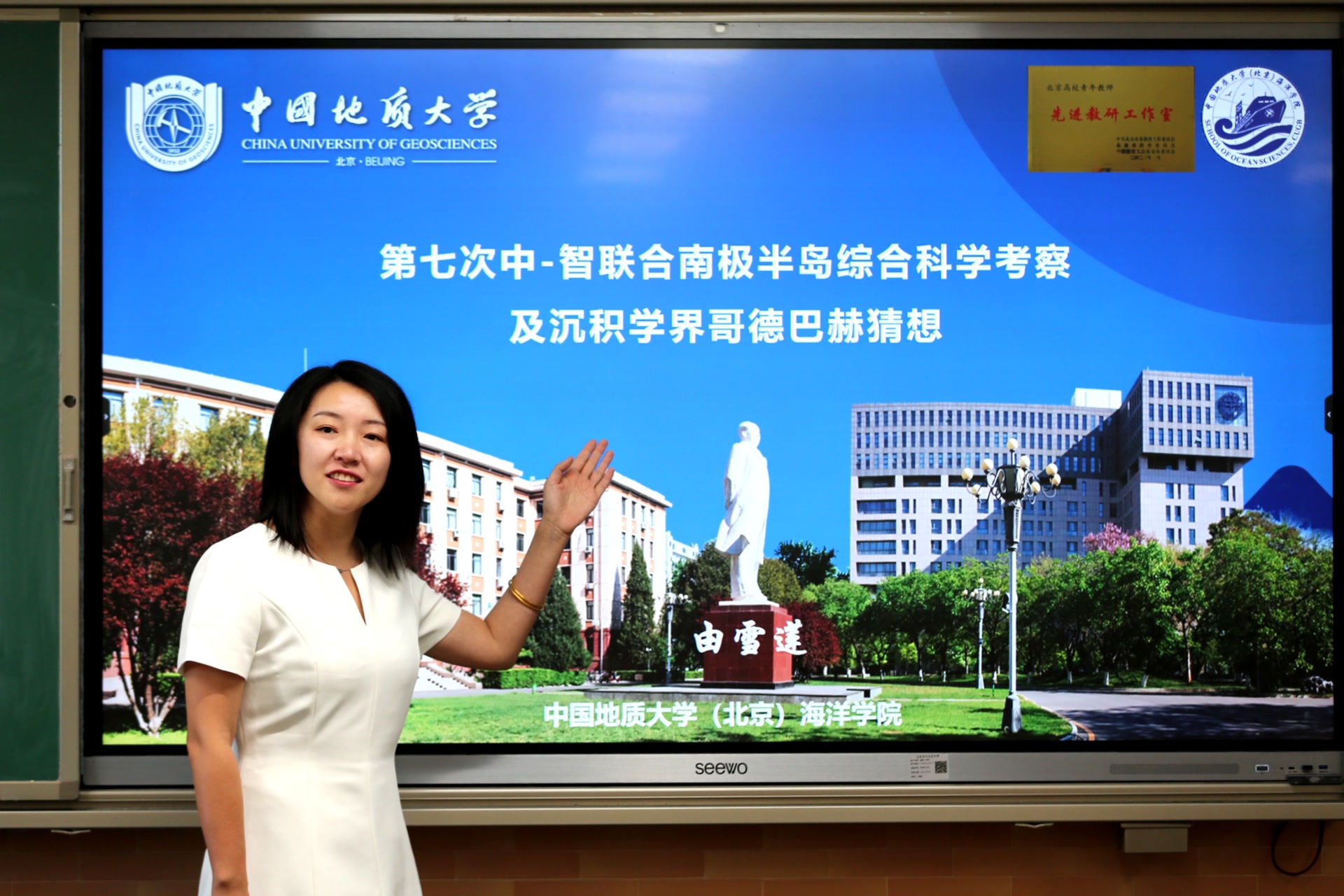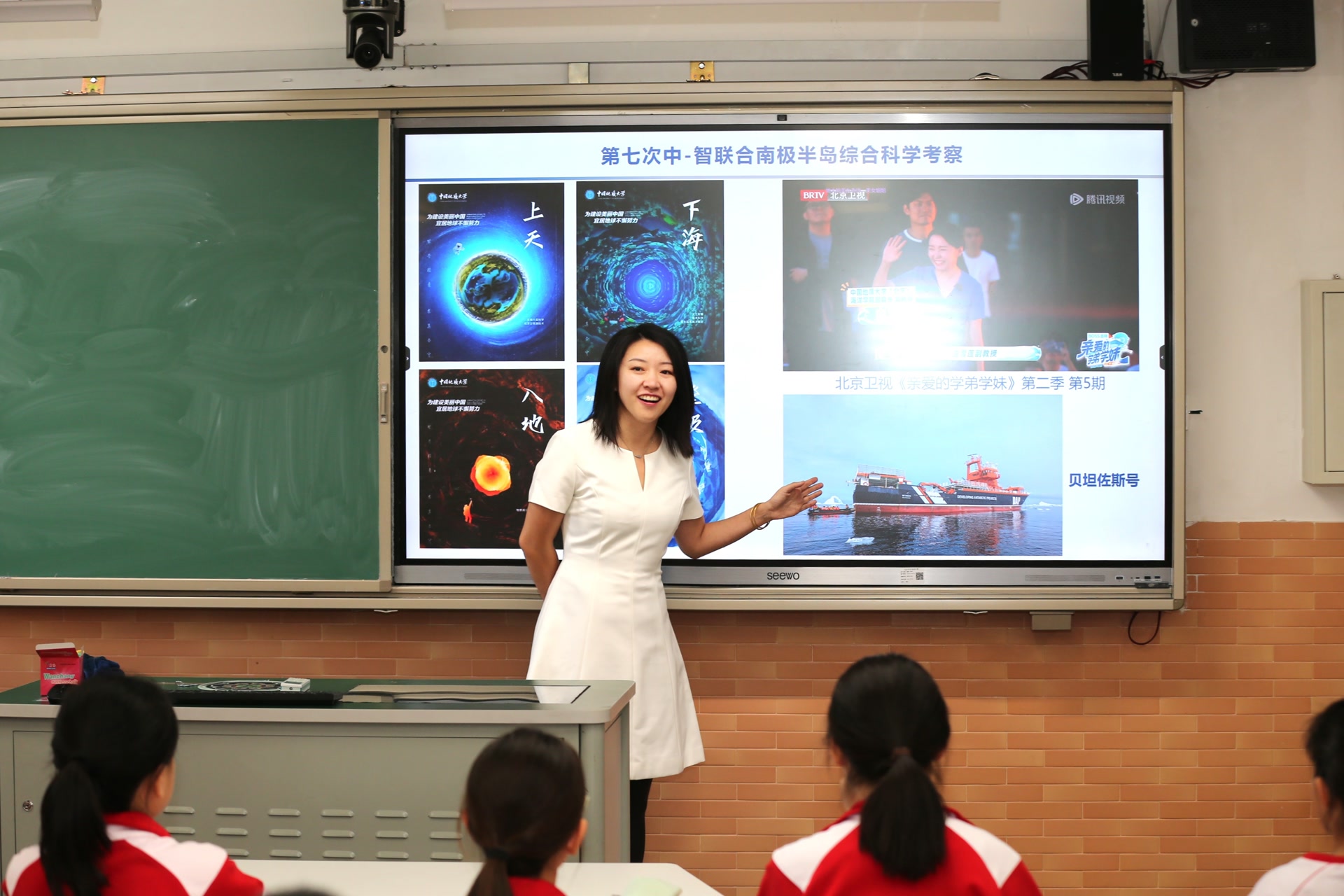 9月18日,在北京市中关村中学双榆树校区,中国地质大学(北京)海洋学院副教授由雪莲正在为初一年级的同学们讲述她赴南极科考的故事。当日,一场主题为“与能源绿色开发”科普活动,在中关村中学双榆树校区举办。毕业于中国科学院的由雪莲博士结合自身在南极科考中的所见所闻及丰富的沉积学专业知识,从南极半岛地质概况、科学家研究关注的南极的科学问题角度出发,用生动有趣的方式为同学们分享了南极科考中的故事和沉积学专业知识,同学们尤其对极地的化石,研究生命起源的叠层石,目前超深层白云岩油气储集体的岩石薄片等标本特别感兴趣。同学们现场反响热烈,非常积极踊跃的提出各种感兴趣的问题。此次讲座以丰富活动内容,创新活动形式,推动了地球科学的科学文化传播,有助于提高中学生地球科学素养。王振摄