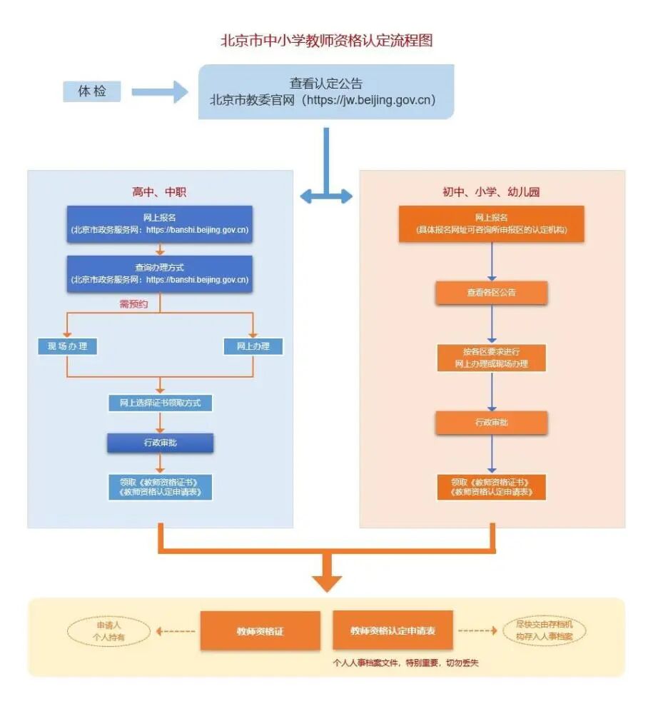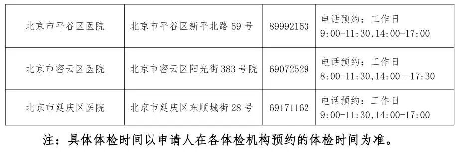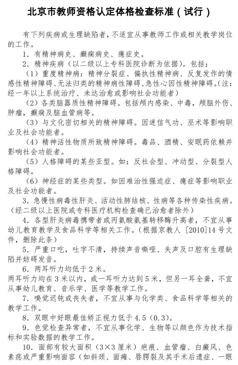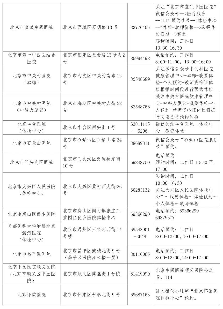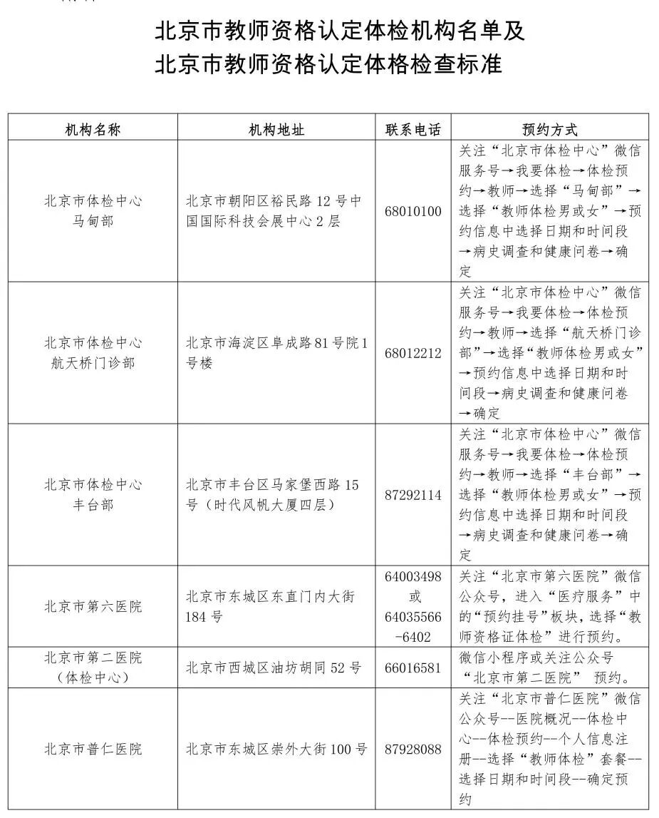 2.体检方式:申请人自行选择指定的教师资格认定体检机构在规定时间内完成体检。体检机构名单、联系方式以及体检标准详见附件2:《北京市教师资格认定体检机构名单及北京市教师资格认定体格检查标准》。