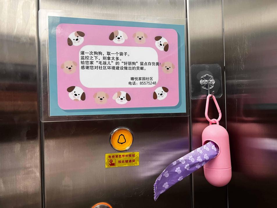 针对“遛狗不清便”导致的环境卫生问题,社区从硬件设施优化入手破解治理痛点。工作人员走访调研后,创新推出“电梯内狗便袋取用盒”,在各单元电梯内放置封装好的可降解狗便袋,实现“出门即取、即用即扔”的便捷体验,从源头消除居民“想清理却不方便”的障碍,并规划宠物活动专区,定期开展消杀清洁。