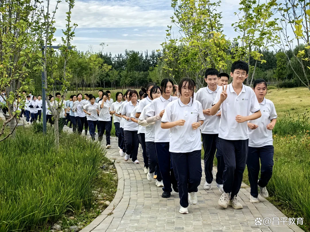 课间操时段,昌平区天通苑学校初中部的学生在老师们的陪伴下,沿奥北森林公园的林道奔跑,湛蓝的天空、斑驳的树影与整齐的队伍相映成趣。