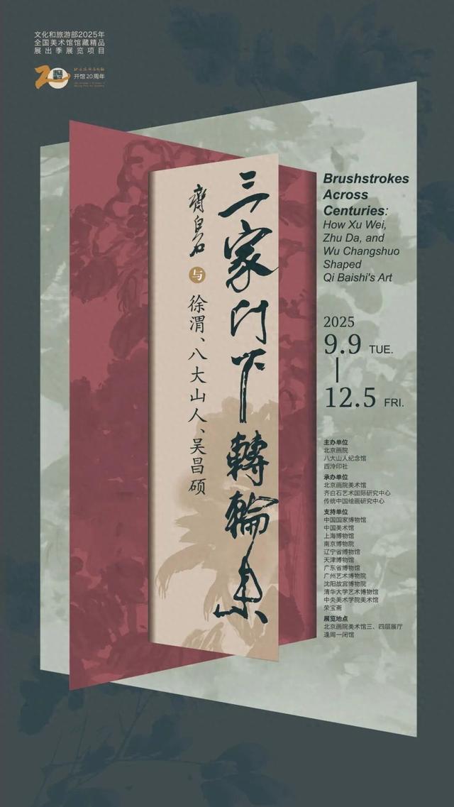 此次展览入选“文化和旅游部2025年全国美术馆馆藏精品展出季展览项目”,联合了中国国家博物馆、中国美术馆、南京博物院、辽宁省博物馆、天津博物馆等十余家国内重量级文博单位,历时数年筹备,以齐白石对三家的致敬与师学为轴,展出了徐渭、八大山人、吴昌硕、齐白石作品70余件套,通过“百代同辉”“萍翁造化”“缶庐铁笔”“青藤雪个”四个单元,梳理了中国大写意花鸟画自明清至近现代的磅礴源流与风格演进。