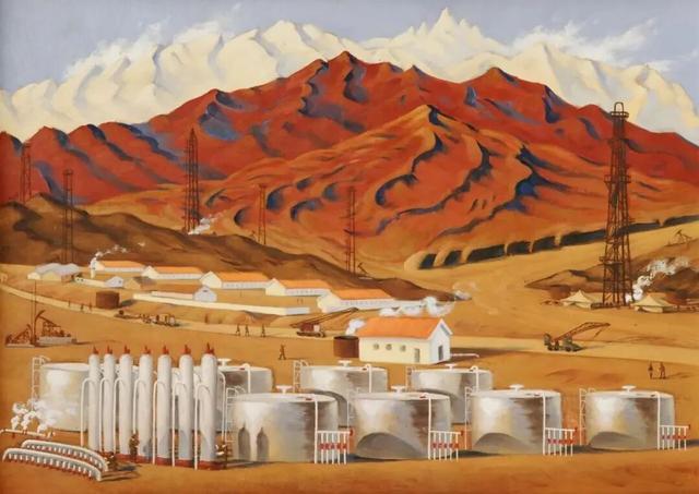 《油站朝晖》 1962年 板面油彩 44.2×61.8cm 中央美术学院美术馆藏