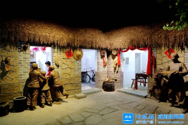 不远处,有一座胶东海草房模型,石墙草顶、古朴厚重,几尊渔民雕塑栩栩如生,让人仿佛真的见到了一户渔家正围坐笑语,岁月静好的渔家生活、与海相依的质朴情怀都在柔和的灯光里渐渐清晰。