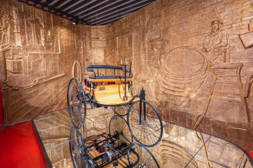 它安静地停放在展台上,三个实心橡胶轮胎、裸露的机械结构,吸引了我的目光。展板介绍:这是世界上第一辆以汽油为动力的车。