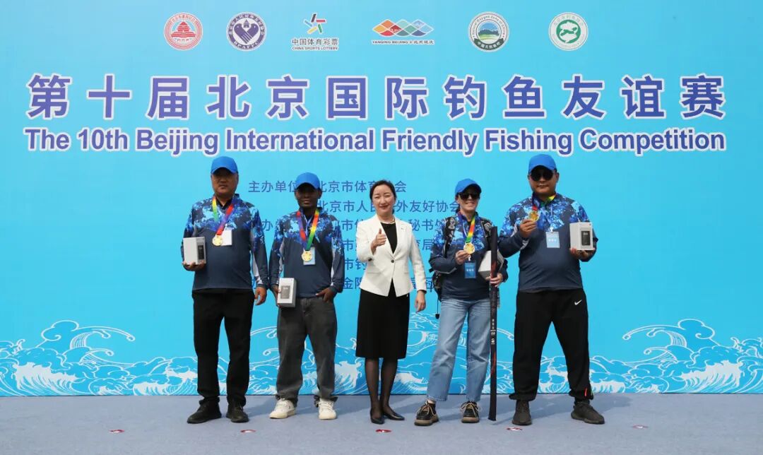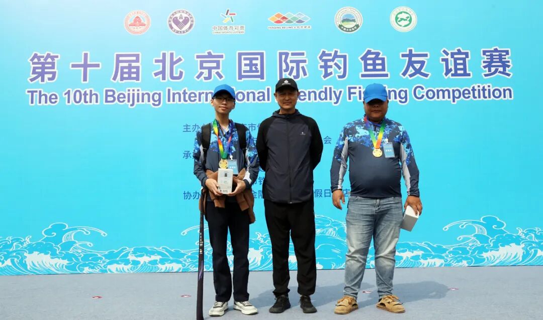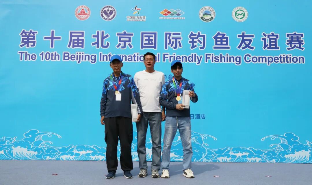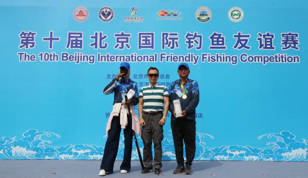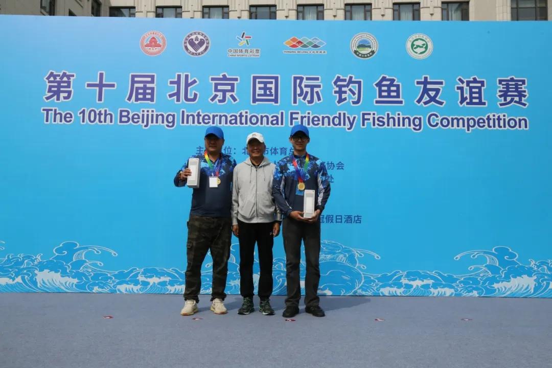 北京市钓鱼协会会长邵敬贤(中)为获得第四名的一对选手颁奖