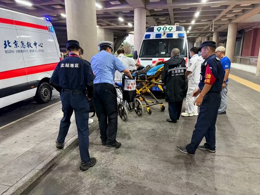 近期,降雨持续不断,一名老年旅客在北京北站广场不慎摔倒,失去行动能力。