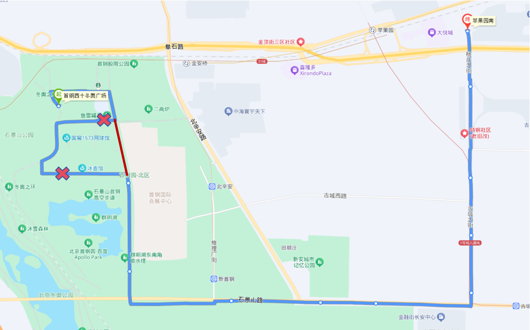 夜间末班车路线为首钢园-古城地铁站-京燕饭店-万商花园美居酒店,运营时间为22:00-23:00(按赛程时间适时调整)。