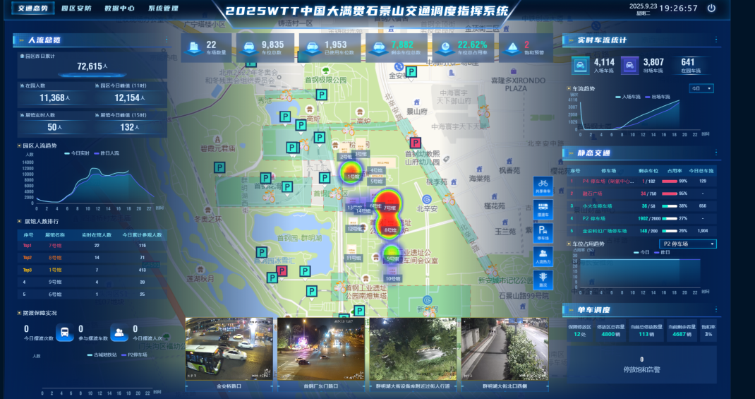 赛事期间,启动2025年WTT中国大满贯赛事石景山交通智慧调度系统,实时监测场馆周边停车场数据、路况信息、交通卡口数据、园区内安防监控、园区人流量等数据,实现场馆及周边区域交通态势一张图,实现统一指挥、统一调度。