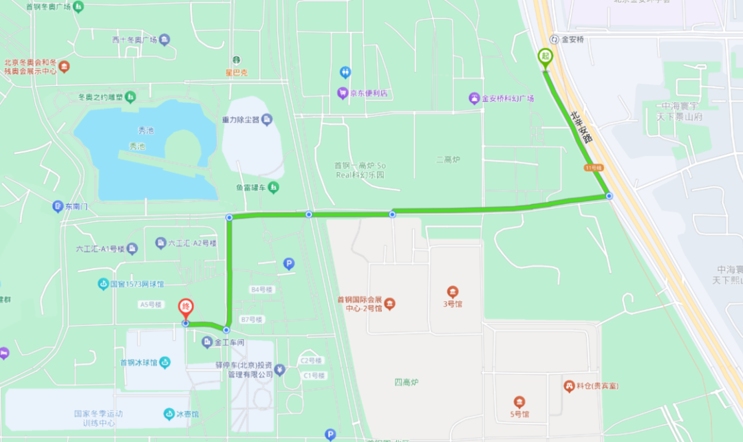 新首钢地铁站至首钢滑雪大跳台线路示意图(约1.3千米)