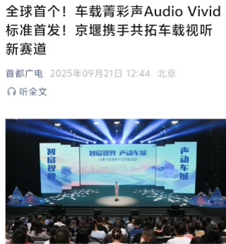"智启视界 声动车城"——京堰车载视听产业对接活动,在十堰传媒中心隆重启幕。首都广电微信公众号以题为《全球首个!车载菁彩声Audio Vivid标准首发!京堰携手共拓车载视听新赛道》,对该活动进行了报道。
