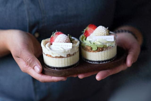 北京市一商家展示自己使用了小米作为原料之一制作的新品小米布丁。新华社记者 鞠焕宗 摄