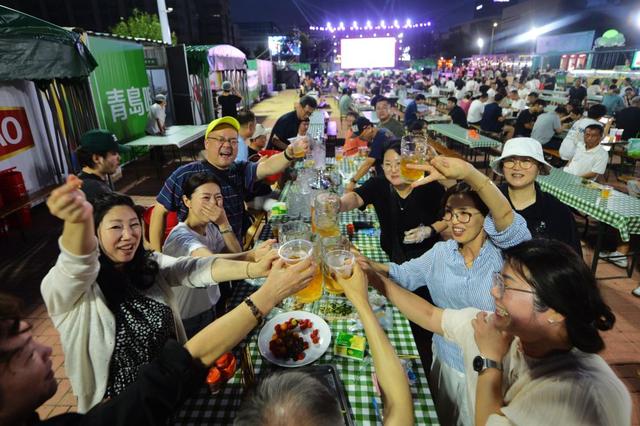 在第35届青岛国际啤酒节崂山会场,游客享受啤酒节夏夜狂欢。 新华社发(王海滨 摄)