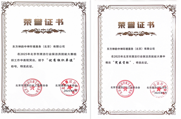更为亮眼的是,中坤环境作为本次大赛的唯一承办单位,在赛事筹备与执行全过程中发挥了不可或缺的作用。赛事前期,公司积极协助主办单位北京市清洁行业工会联合会与北京清洁行业协会,深度参与竞赛环节的设计与各项筹备工作,为赛事顺利开展奠定坚实基础;比赛期间,公司全力提供高效、细致的后勤服务,从场地保障到人员协调,每一个环节都精益求精,确保赛事有序推进。这份无私奉献、团结向上的企业风貌,得到了主办单位与各参赛队伍的高度认可,公司因此成功斩获 “突出贡献奖” 与 “优秀组织单位” 两项重要集体荣誉。