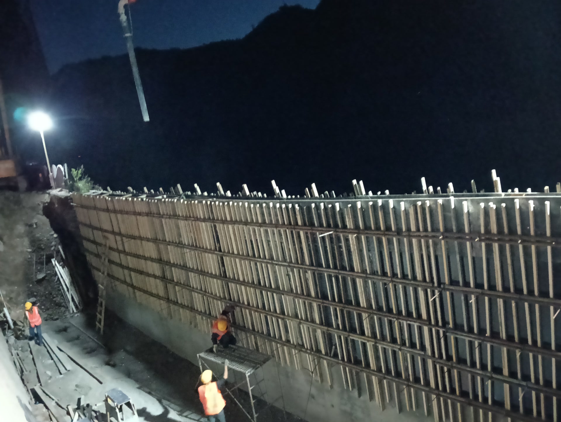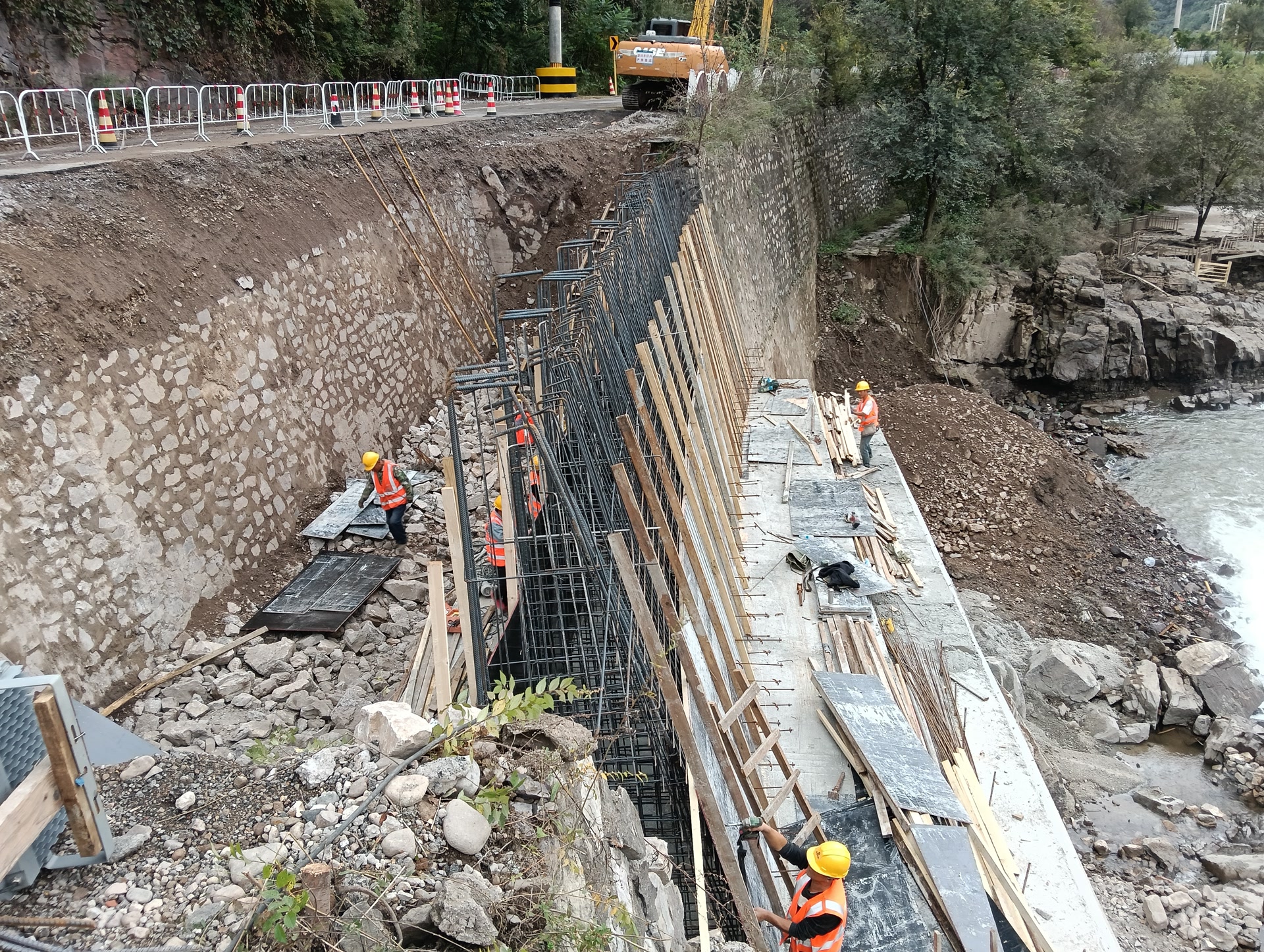 施工期间,作业团队克服了水位下降时间不确定,不具备作业面等困难,采用了“土石围堰+铅丝石笼填筑+土工膜防渗”组合方案,在湍急河道中筑起临时挡水屏障,同时在背水面开挖排水沟,快速降低作业面水位。针对挡墙薄弱问题,工程创新采用“双层防护”工艺,在拆除原有旧路及挡墙后,新建片石混凝土基础、扶壁式钢筋混凝土挡墙,同步回填路基,重建路面结构。采用这种施工工艺可以有效增强道路基础抗水流冲刷能力,进一步加强道路基础整体稳定性。