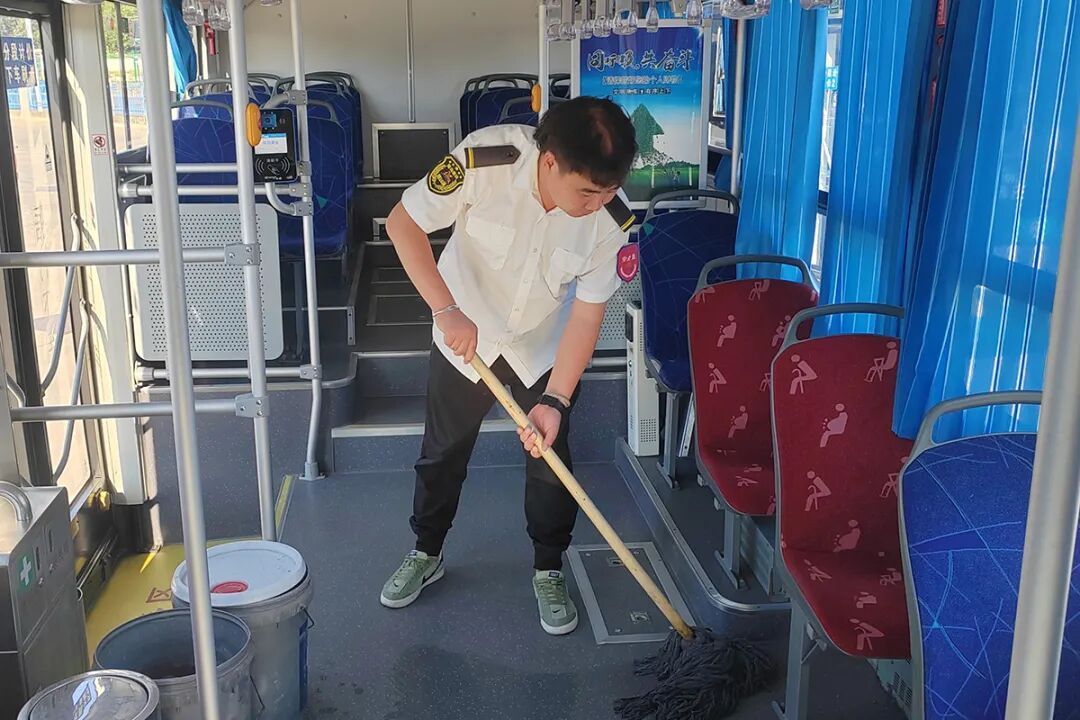 赵金洋对车厢内部进行清洁。