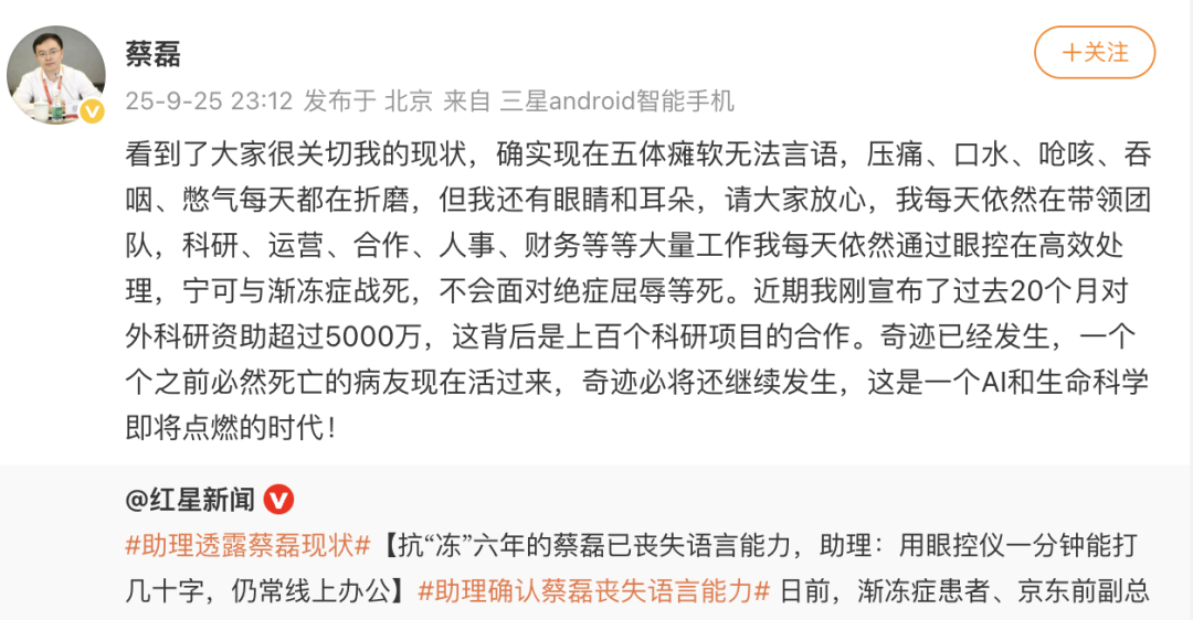 日前,渐冻症患者、京东前副总裁蔡磊的近况引发关注。9月25日,他的助理陈女士向媒体确认,蔡磊已经完全没有语言能力了。当晚,#助理确认蔡磊丧失语言能力登上微博热搜第一。