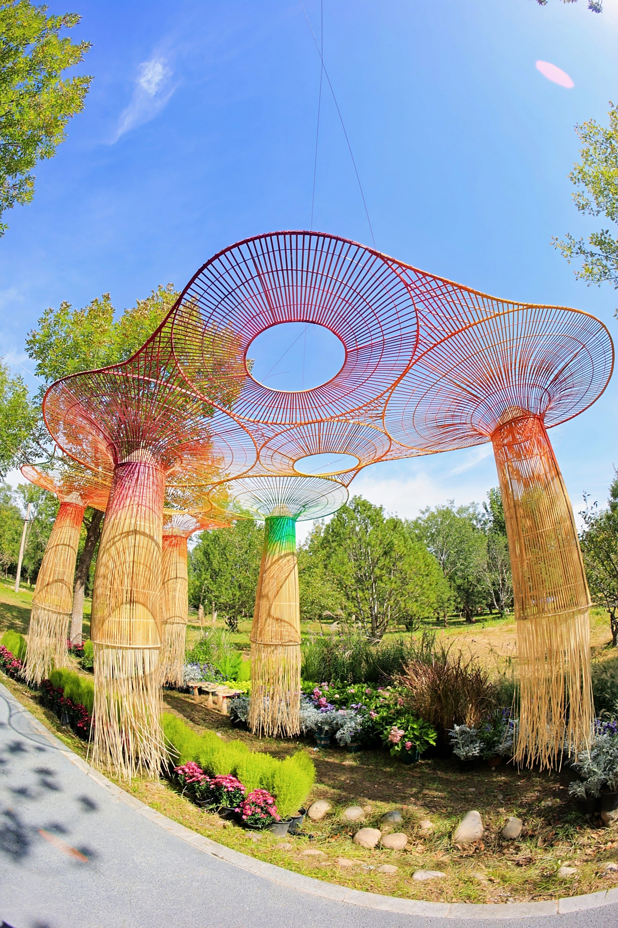 重庆大学、西南大学与斯图加特大学联合设计的《气候盒子》用木制框架与镜面界面打造“气候与生命交互载体”,镜面随天气开合,反射林间光影;东华大学的《彩练浮云》以竹为骨、以光为魂,诠释“赤橙黄绿青蓝紫,谁持彩练当空舞”的诗意;西安交通大学的《间隙》则用圆与三角的几何关系,引导市民体悟“生命打破循环的可能性”……本次入围的10支团队汇聚国内外顶尖高校力量,作品以“生命花园”为核心,呈现出多元创意与生态理念的碰撞,共同指向“人与自然和谐共生”的核心。