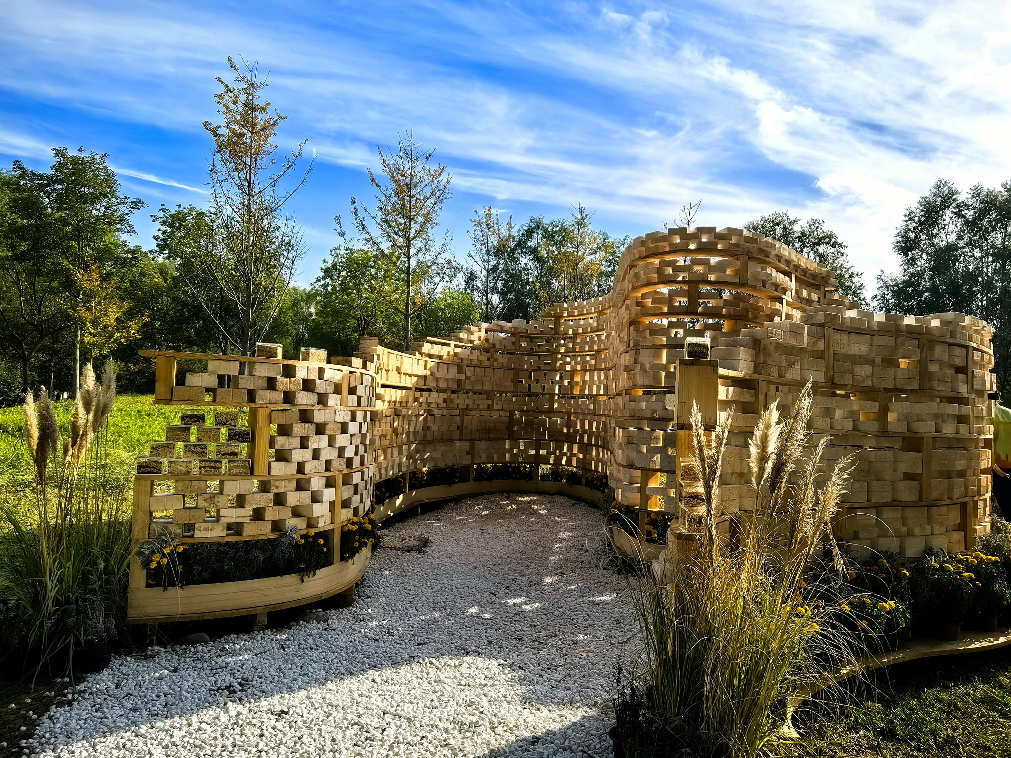 中央美术学院团队的《菌生之境》以生态材料创新为亮点,利用菌丝体与稻壳、麦麸等农业废弃物,经14天培育制成零碳排生物基砖块,2504块砖构成曲线形透水边界,砖体还能随环境变化产生色变,成为“记录生命代谢的活体年鉴”。“建造阶段消纳了农业废弃物,未来解体后还能降解回归土地。”团队成员说,“希望通过作品打破传统营建逻辑,让‘生长即建造’的生态理念被更多人看见。”