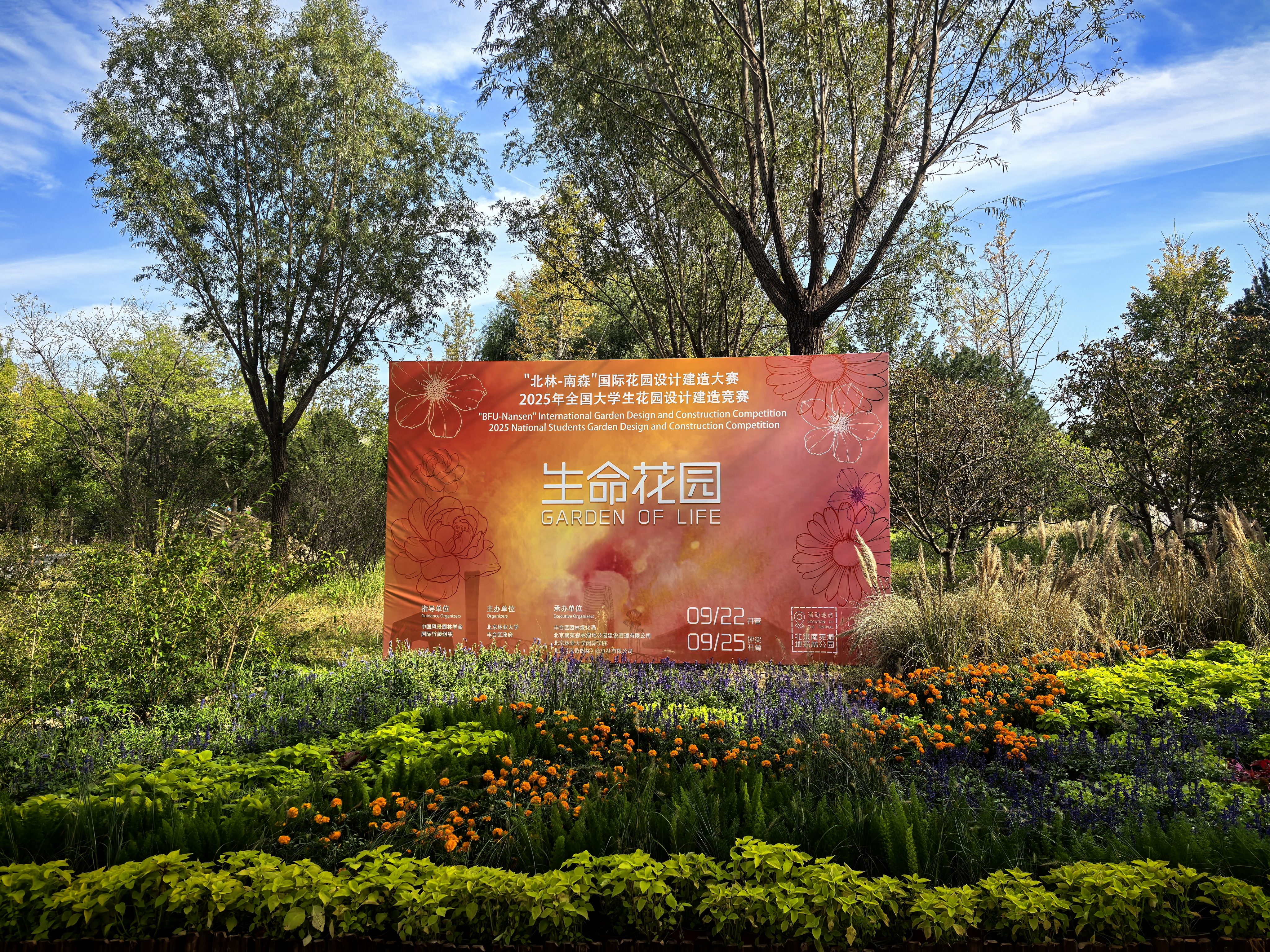 走进南苑森林湿地公园(以下简称“南森”),一片绚烂映入眼帘。9月25日,2025丰台·南中轴(第一届)南囿秋风花园季暨“北林—南森”国际花园设计建造大赛在南森正式开幕。大赛以“生命花园”为主题,吸引了来自近200所国内外高校的400余支团队、总计2000余名园林学子报名参与,最终10组优秀作品脱颖而出,在南森落地绽放。这些“生命花园”于9月25日至11月2日对外免费开放展览。