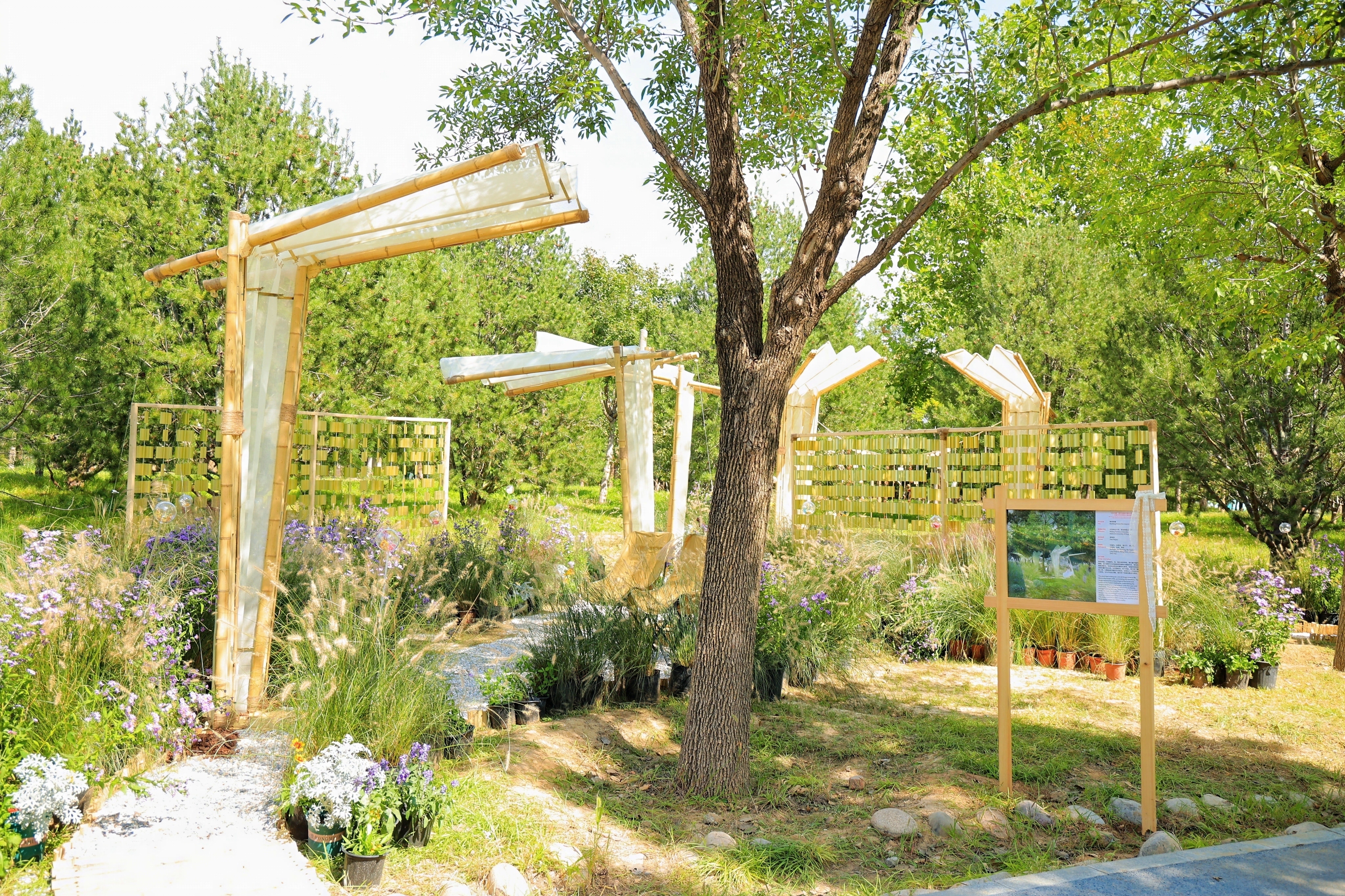 作品《南风知意》以“风”为主题,提取东方折扇的扇骨与扇面形态,将“风”的意象转化为可自由张合的模块化单体,轻盈的构筑散落于林木间,风吹过时单元体或下垂或上扬,形成“人人共创”的互动空间。“在设计决定落地后的深化阶段,它需要在设计理想与施工现实之间寻找平衡点,并且需要多方位的细节,比如材质和植物的选择上根据实际情况进行选择和权衡,这是我们在学校学习的过程中难以得到的宝贵经验。”《南风知意》的创作者、来自北京林业大学与新加坡国立大学联合团队的参赛选手马瑞杰分享道。