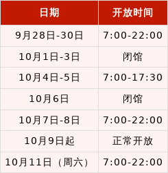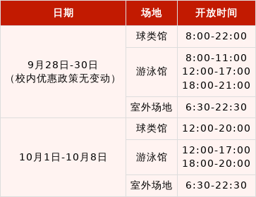1.9月29日8:00-9:30校内离退休专场正常开放,10月6日校内离退休专场暂停开放;10月11日(周六)各运动项目按教学日标准收费。