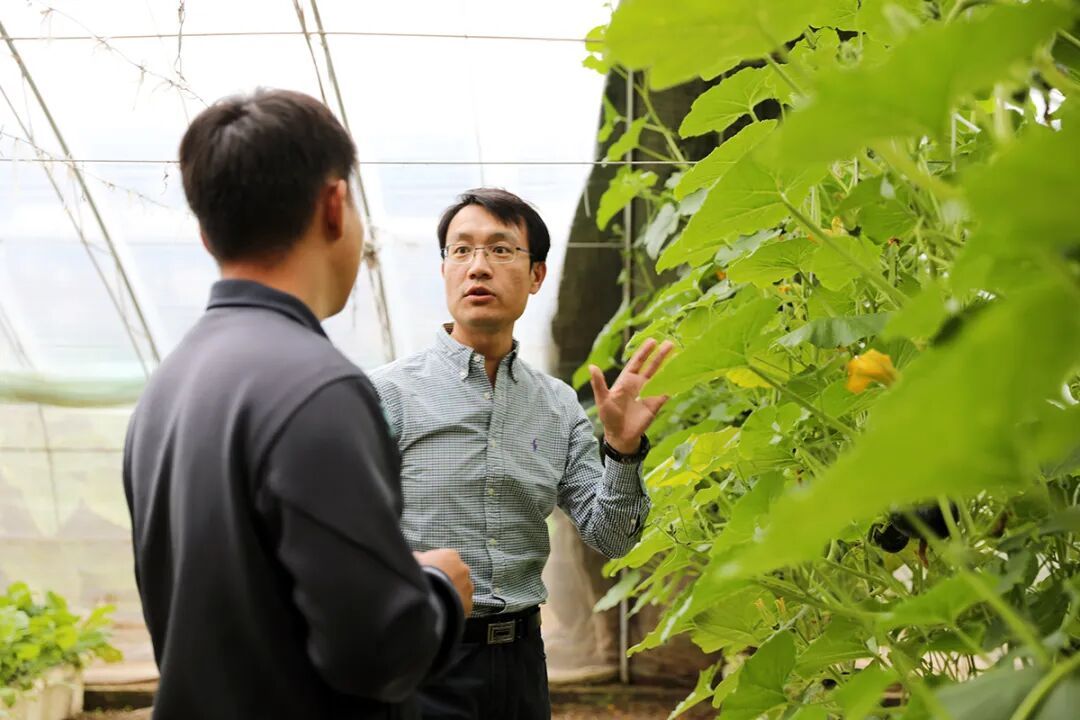 ▲区供销社工作人员与农场负责人交流农作物生长情况。
