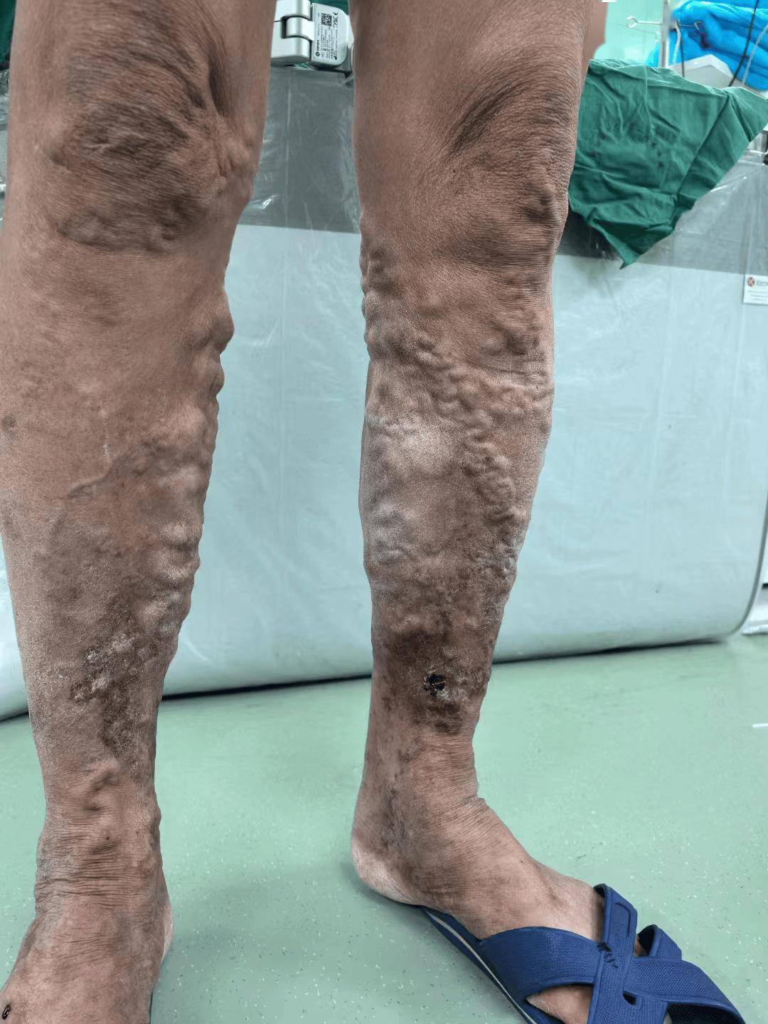 直到今年,情况开始失控:小腿的 “蚯蚓” 越来越粗,站半小时就酸胀得厉害,晚上睡觉还总抽筋,甚至脚踝处隐约泛起了褐色的斑。家里人急了,硬拉着她去了医院。