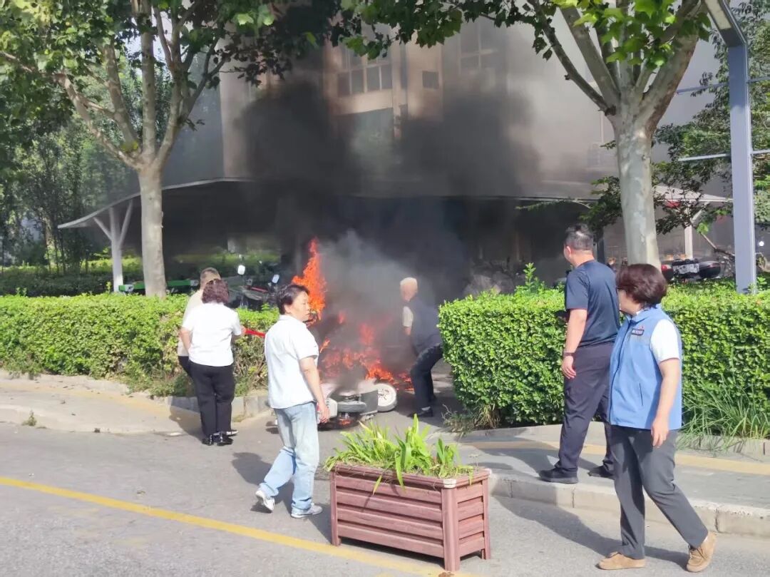 事发当时,物业工作人员正针对电动自行车充电桩(棚)、环境卫生、消防设施、自防自救物资配备等开展国庆节前安全检查,发现2号楼附近开始冒烟,立即启动消防应急处置预案,其中一人立即联系物业应急分队,其余人火速赶去现场。“就几秒钟的时间,火势就大了起来,灭火器根本不管用。”