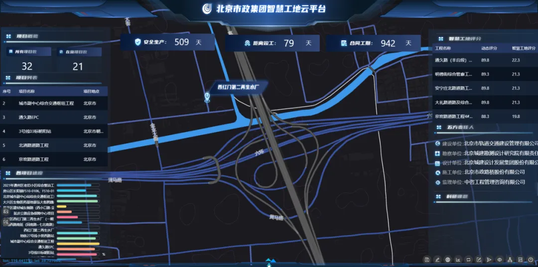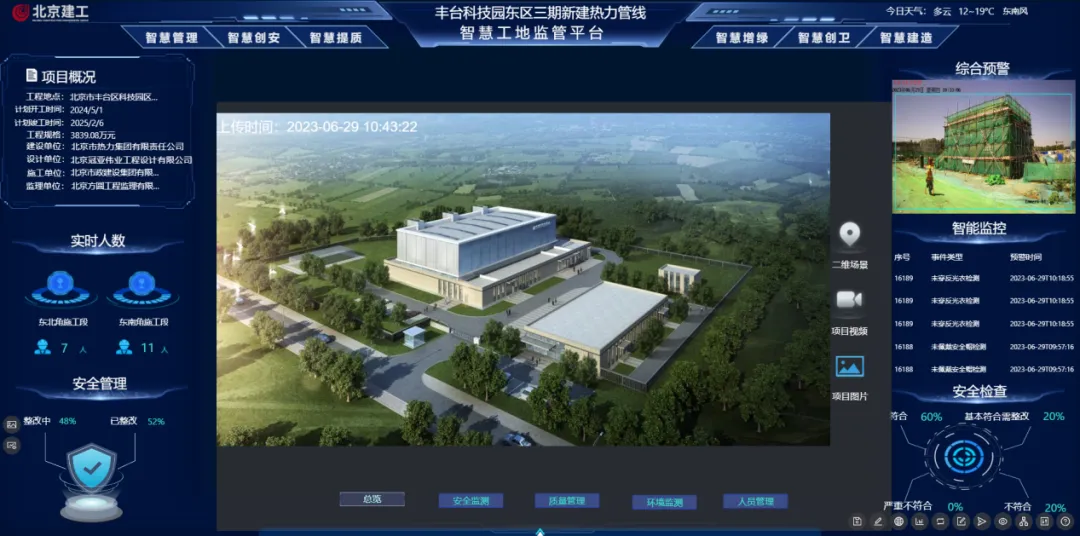 该平台对标《北京市房屋建筑和市政基础设施工程智慧工地做法清单(2024年版)》要求,开发了六大模块、四十余项功能,覆盖智慧管理、安全、质量、环保等多个方面。在平台上,工地现场动态可一图统揽,且能及时推送问题预警,闭环整治质量隐患,真正实现工程“在线管、可视控、智能判”。