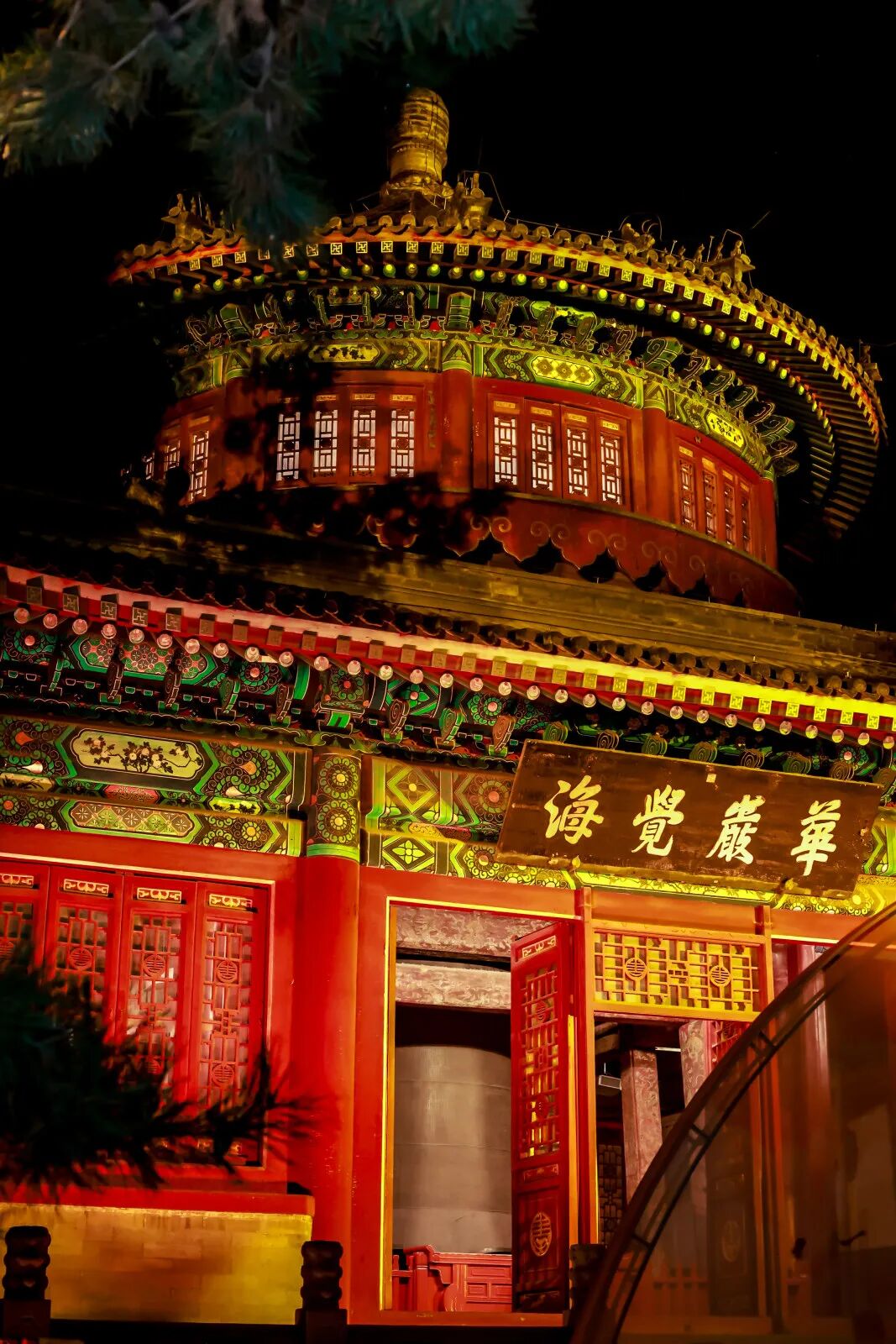 朱红宫墙、明黄点缀、华灯初上