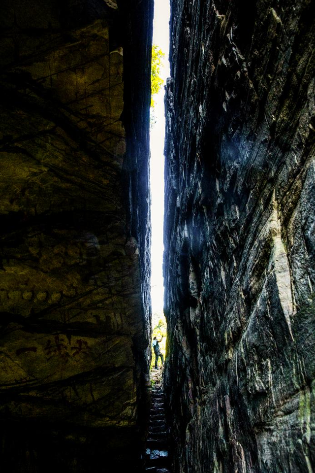 玻璃台一线天:由山体断裂形成的狭长裂缝,形成了独特的景观。上山岔路口左行,徒步五分钟即达。