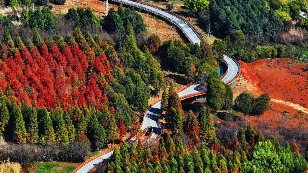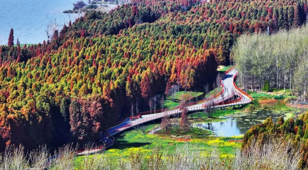 红橙渐变S桥身超上镜!清晨薄雾未散时,水杉林光影碎在湖面,拍“桥身卧波”绝了。