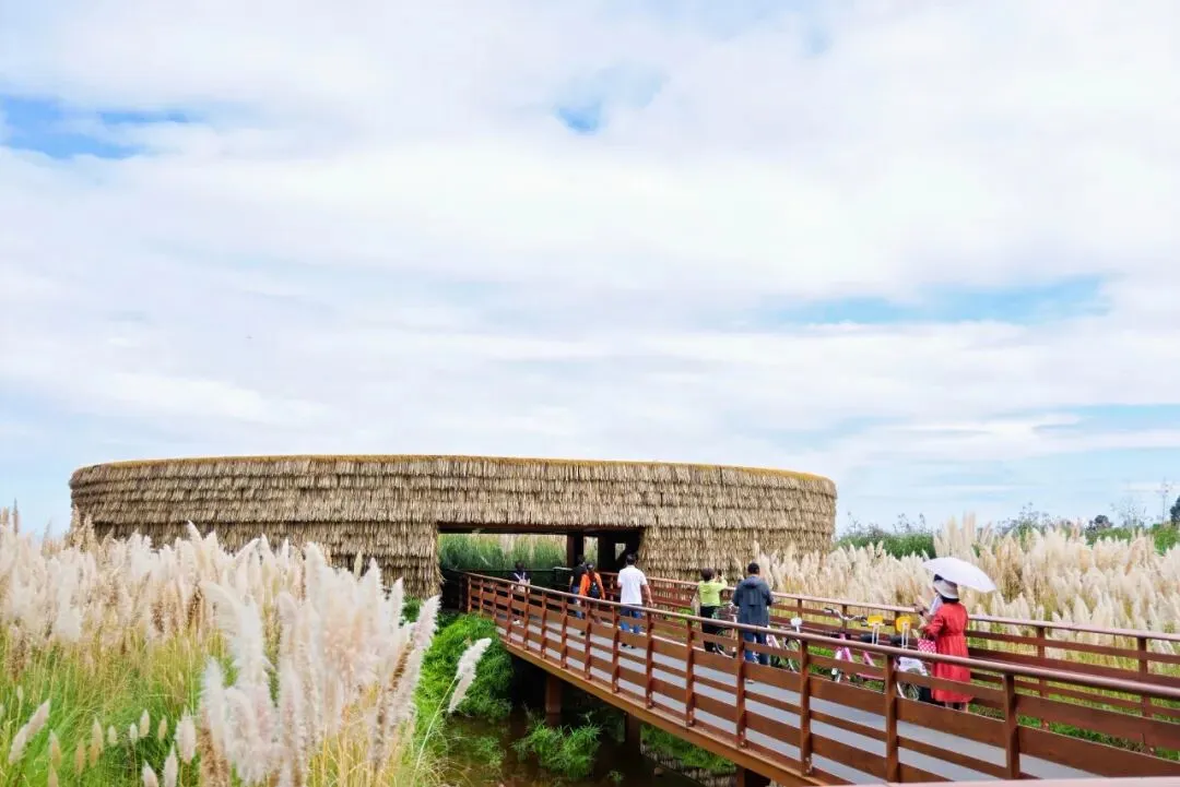 原木色栈桥浮在苇荡里,白鹭从头顶掠过的瞬间赶紧抓拍!十一假期期间芦苇开始泛白,风一吹像雪海。
