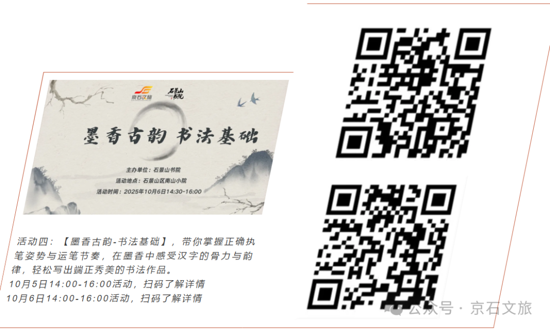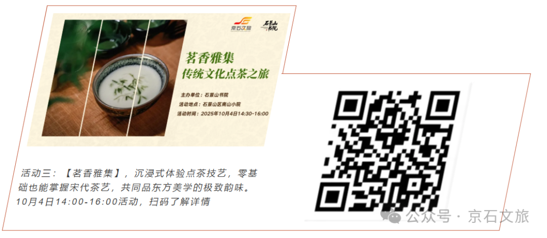 南山小院作为活动的起点,将设立综合服务中心和“石景山礼物专柜”。同时,这里还将开展多项文化体验:《中国书法艺术演进展》及《石景山新词牌精品展》免费对公众开放,每天一场的国学课堂将教授国画基础、壁画趣玩、茗香雅集等内容,茶事活动则每日设定不同主题,让游客静享雅致时光。