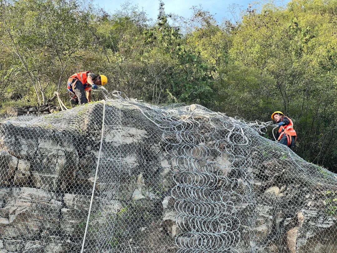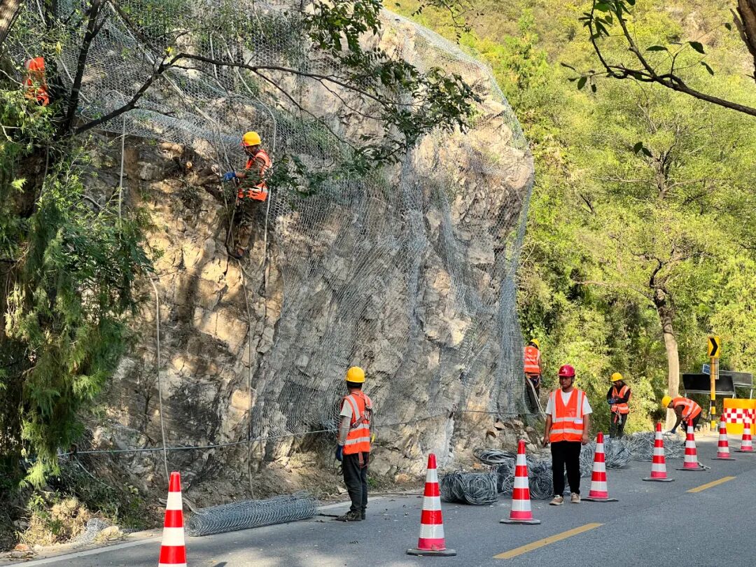 在南雁路施工现场,身穿安全措施的工人正在“飞檐走壁”,为路侧山体加装防护网,好像罩上了一层“铁布衫”。这种以引导防护系统和被动防护网为主要的治理措施,可以利用网的柔性和拦截强度,通过大变形来吸收和分散落石的冲击,使其运动速度和轨迹受到控制,避免了落石的弹跳和飞溅,最终被“引导”进入预先设定的收集区,最大程度减少崩塌落石对道路交通的影响。