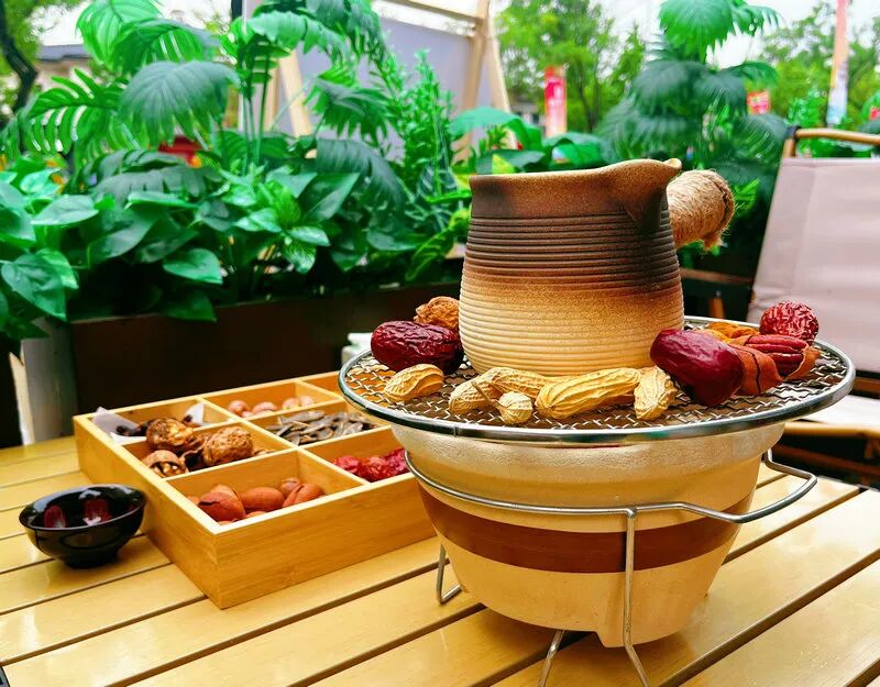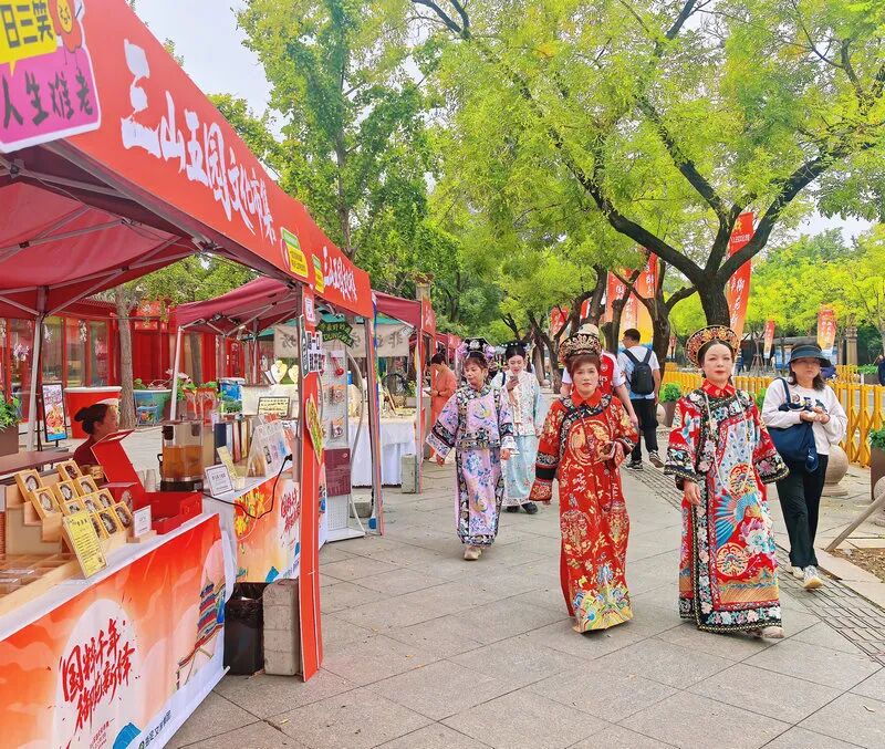 “刚出锅的老北京茶汤,热乎嘞!”文化市集区,摊主的吆喝声伴着甜香飘远,糜子面冲调的茶汤上撒满红糖、芝麻,咬一口软糯香甜;不远处的药膳小吃摊前,山药糕、茯苓饼整齐码放,摊主还贴心地贴出“健脾养胃”“祛湿安神”的功效标签。