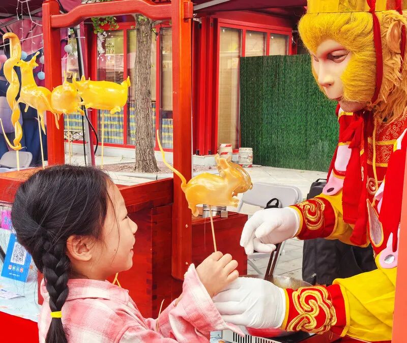非遗展示区更是热闹。吹糖人艺人师傅指尖翻飞,一团温热的糖稀转眼变成蹦跳的小兔子、展翅的蝴蝶,孩子们围着拍手叫好,不少家长掏出手机记录;“海淀有礼”文创展位上,融合颐和园昆明湖、圆明园兽首元素的徽章、扎染围巾被游客反复翻看,“买个徽章当伴手礼,既好看又有文化味儿。”